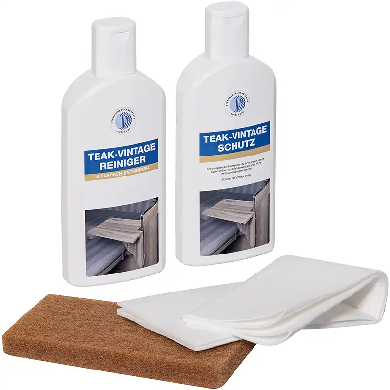 Mit diesem Pflege Set, bieten Sie Ihren Teak Vintage Möbeln den kompletten „Rundum-Schutz“ von der Pflege bis zum langanhaltenden Schutz. Mit dem Teak-Vintage Reiniger & Flecken Entferner, befreien Sie Ihre Möbel von groben Schmutz. Der Teak-Vintage Schutz, ist ein transparenter Fleckenschutz & Versiegler, damit Lebensmittel- und Getränkerückstände nicht ins Holz eindringend können und schützt somit die vorhandene und gewünschte, Vintage Optik Ihres Möbelstückes.