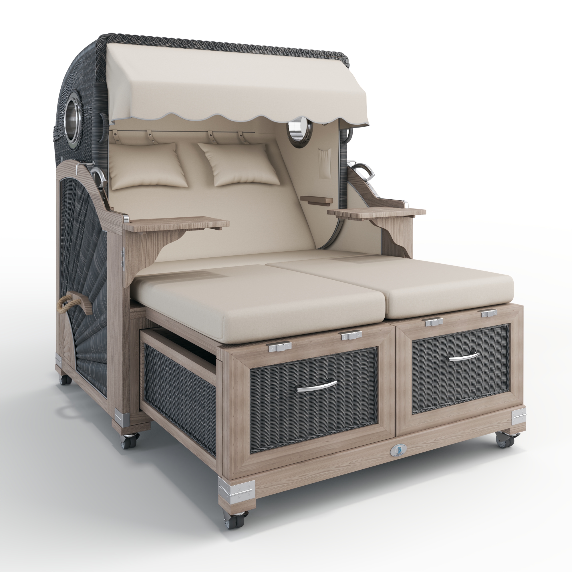 Genießen Sie höchsten Komfort mit dem Stilkorb Buxtehude, der Luxus-Variante eines klassischen Strandkorbs. Dieser stilvolle 2,5-Sitzer bietet nicht nur Platz für gemütliche Stunden, sondern begeistert auch mit einer großzügigen, ausziehbaren Liegefläche – perfekt für entspannte Momente in der Sonne.