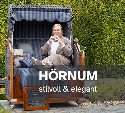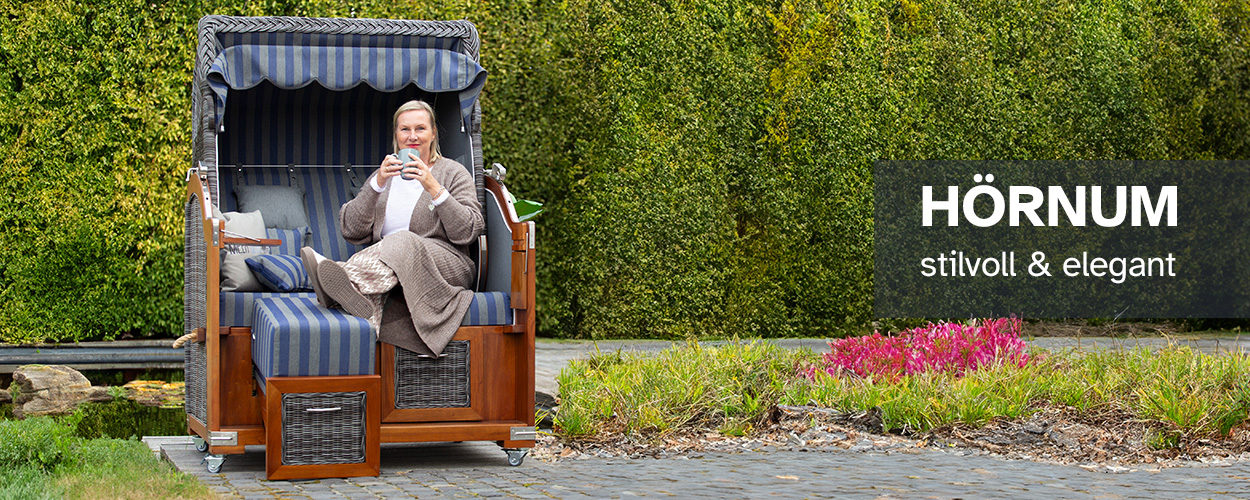 Der Strandkorb Hörnum ist die ideale Rückzugsoase für entspannte Momente auf Terrasse, Balkon oder im Garten. Das edle Mahagoniholz und das geflochtene PE-Geflecht verleihen ihm eine ansprechende Optik, während die passenden Stoffe für gemütliches Flair sorgen.