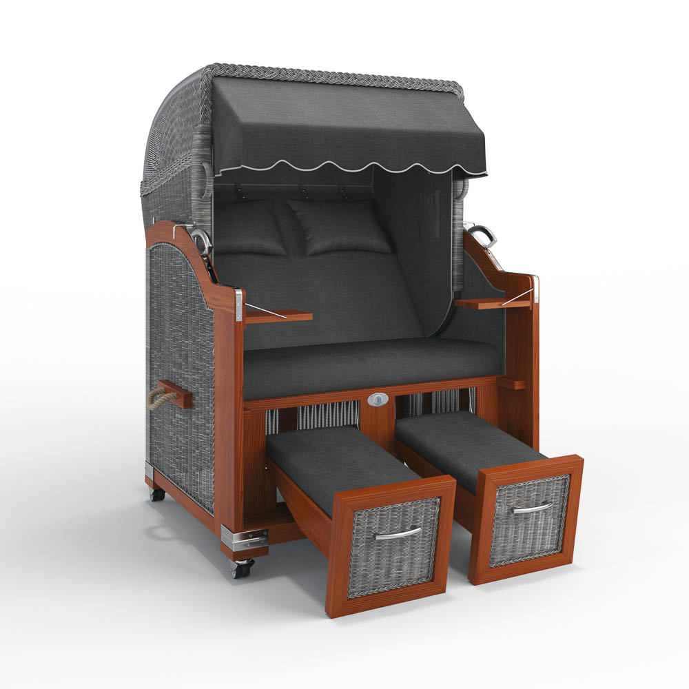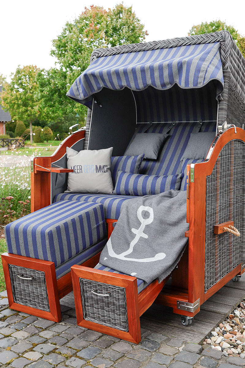 Der Strandkorb Hörnum Mahagoni ist der perfekte Rückzugsort für ruhige Stunden. Er schmückt Terrasse und Balkon und wird auch im heimischen Garten zum dekorativen Blickfang. Das edle Mahagoniholz wird mit gerade geflochtenem PE-Geflecht kombiniert und die passenden Stoffe sorgen für ein gemütliches Strand-Flair. Besonders praktisch sind die kleinen ausklappbaren Tischchen an den Seiten, auf denen Bücher, Getränke und Snacks eine sichere Ablage finden. Dank der mitgelieferten Rollen lässt sich der Strandkorb leicht verschieben und die inklusiv erhältliche Abdeckhaube schützt vor Feuchtigkeit und Verschmutzungen. Sinnvolle Details wie die herausziehbaren Fußablagen und die seitlich angebrachten Taschen für Zeitschriften und Smartphone begeistern bei diesem Strandkorb-Modell.