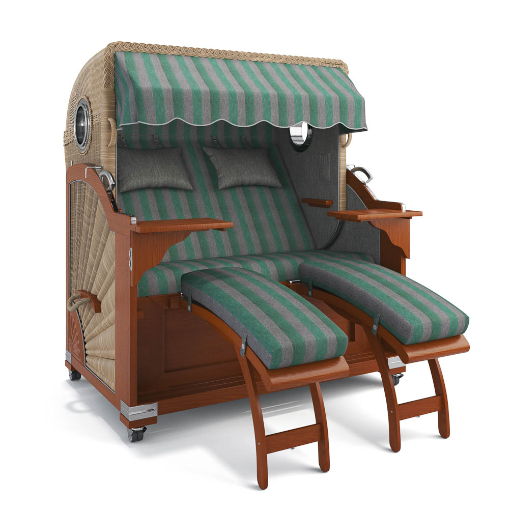 Mit dem Strandkorb Kampen verwandeln Sie Garten, Terrasse oder Balkon in die perfekte Urlaubs-Oase. Genießen Sie entspannte Stunden im Grünen mit allem Komfort. Der hochwertige Volllieger überzeugt mit ausgewählten Materialien und vielerlei Annehmlichkeiten. Er wird aus robustem Teak-Holz und edlem PE-Geflecht gefertigt und ist wind- und wasserfest. Die im Lieferumfang enthaltene Abdeckhaube bietet Ihrem Outdoor-Möbel dauerhaften Wetterschutz. Für den Wellness-Faktor sorgen bequeme Polster, höhenverstellbare Fußablagen und der einfach zu verstellende Oberkorb. Mit dem praktischen Duo-Lifter wechseln Sie komfortabel zwischen Sitz- und Liegeposition. Die schwenkbaren Notebook-Tische bieten ausreichend Platz für Laptop, Bücher, Snacks und Getränke und in den Taschen an den Seiten des Strandkorbs lassen sich Zeitschriften und Smartphone verstauen. Ihren Traumstoff für den Strandkorb können Sie aus über 100 verschiedenen Stoffen wählen und dann heißt es: Platz nehmen und relaxen.