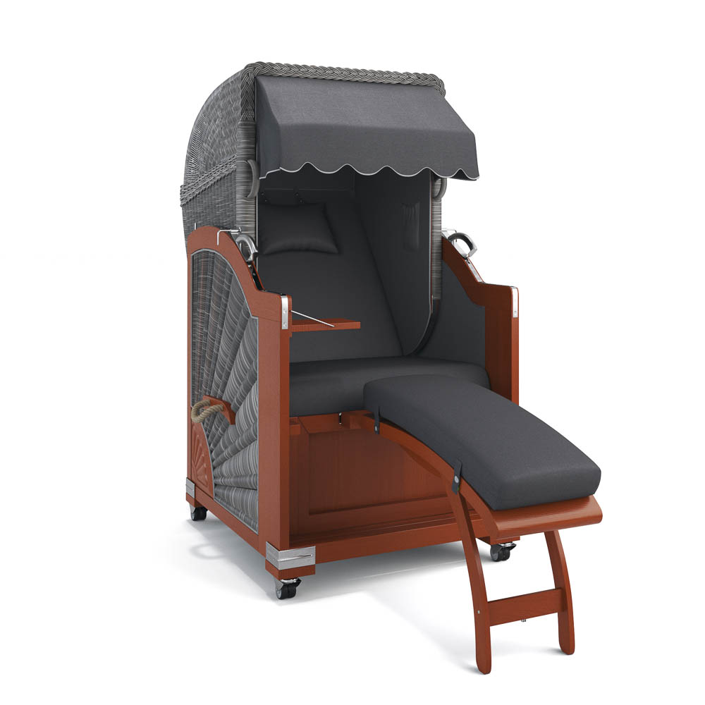 ausziehbare Fußstützen: Ausziehbare Fußstützen sind besonders praktisch, da sie ohne Montage schnell einsatzbereit sind. Ihr klassisches Design fügt sich harmonisch in die Optik des Strandkorbs ein und erinnert an traditionelle Strandkorbmodelle.