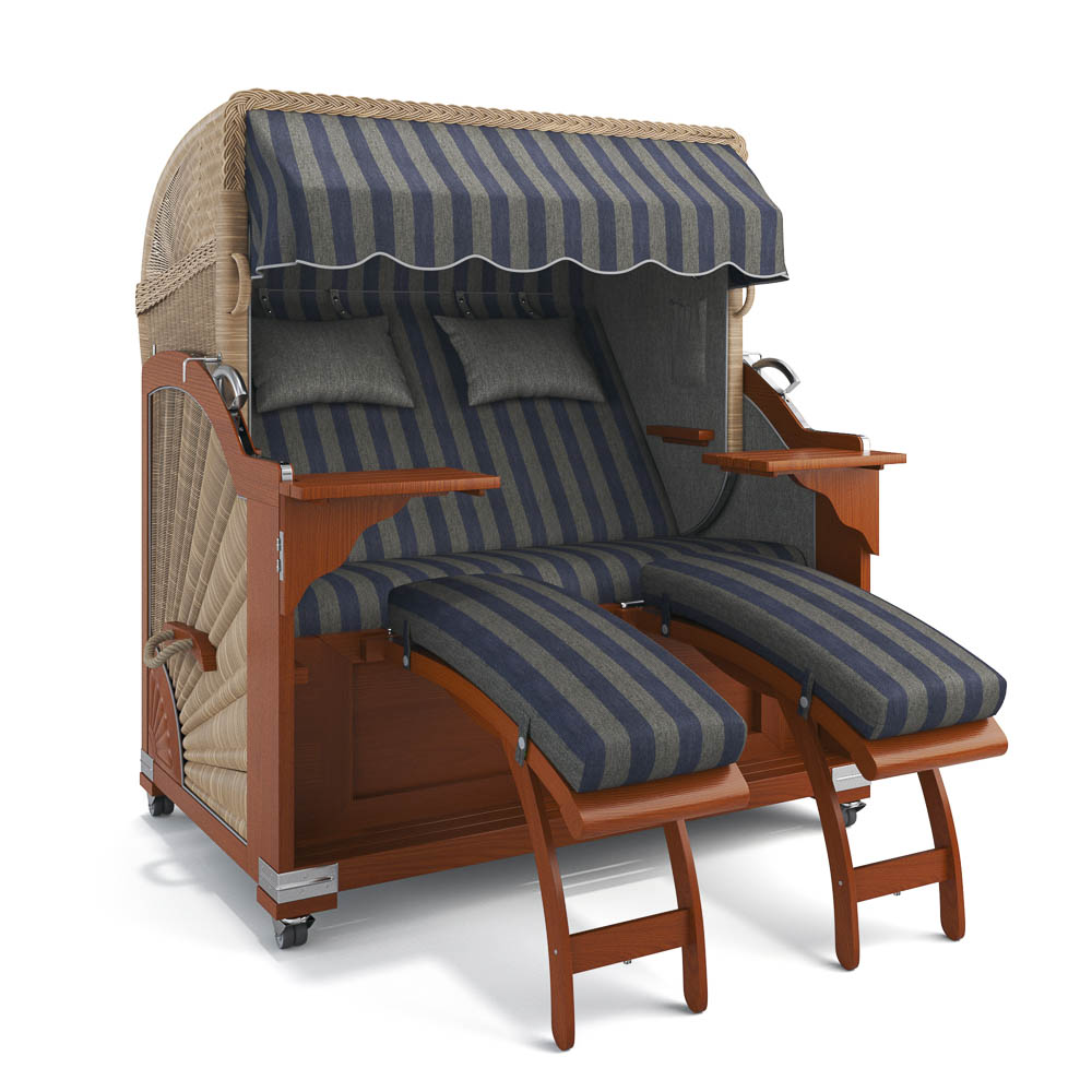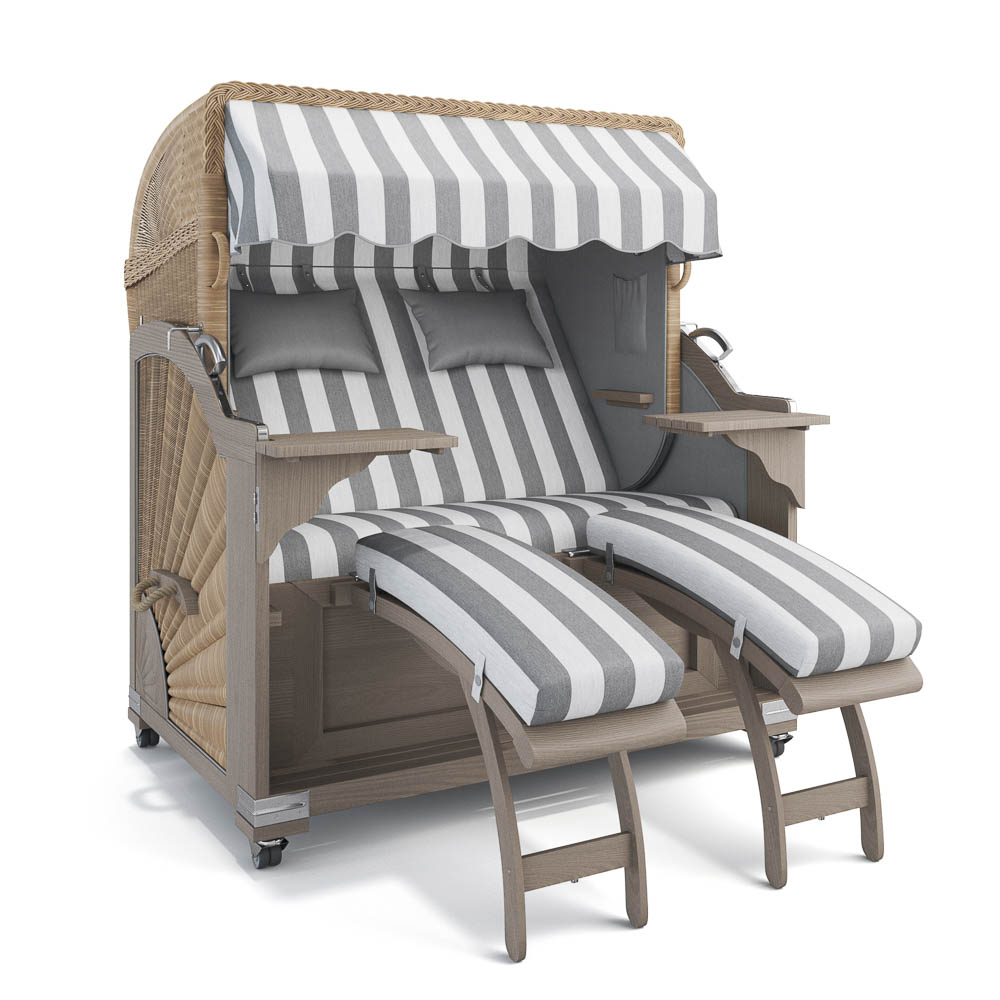 ausziehbare Fußstützen: Ausziehbare Fußstützen sind besonders praktisch, da sie ohne Montage schnell einsatzbereit sind. Ihr klassisches Design fügt sich harmonisch in die Optik des Strandkorbs ein und erinnert an traditionelle Strandkorbmodelle.