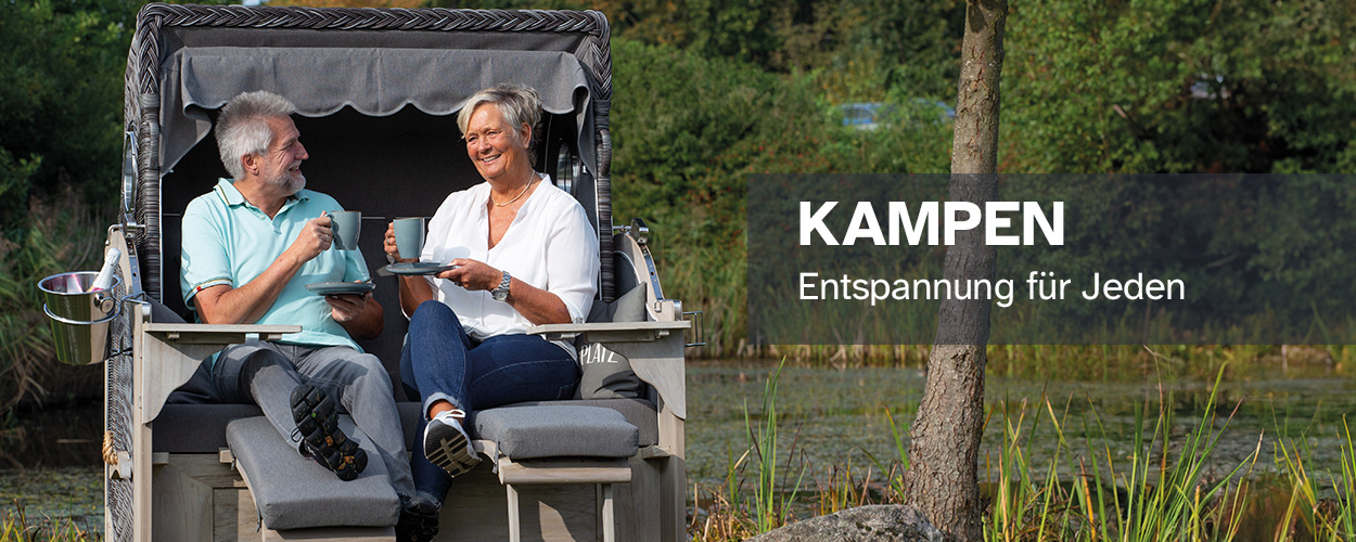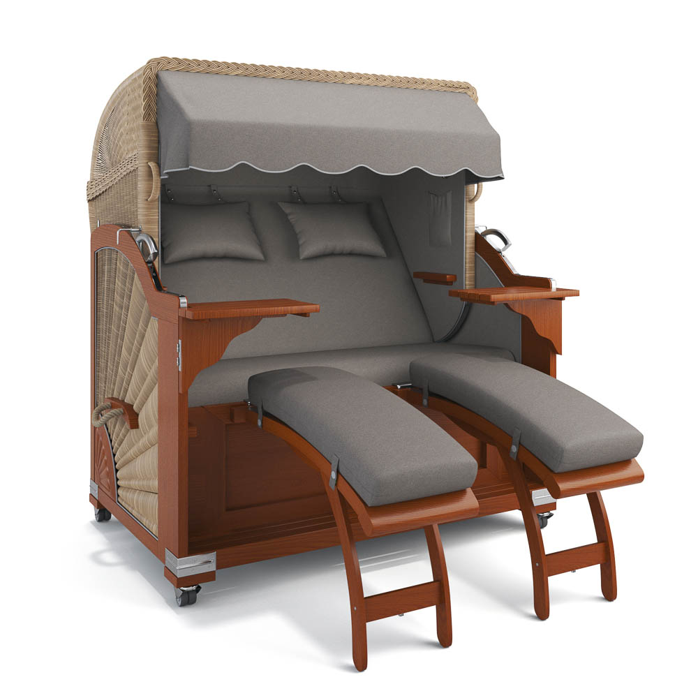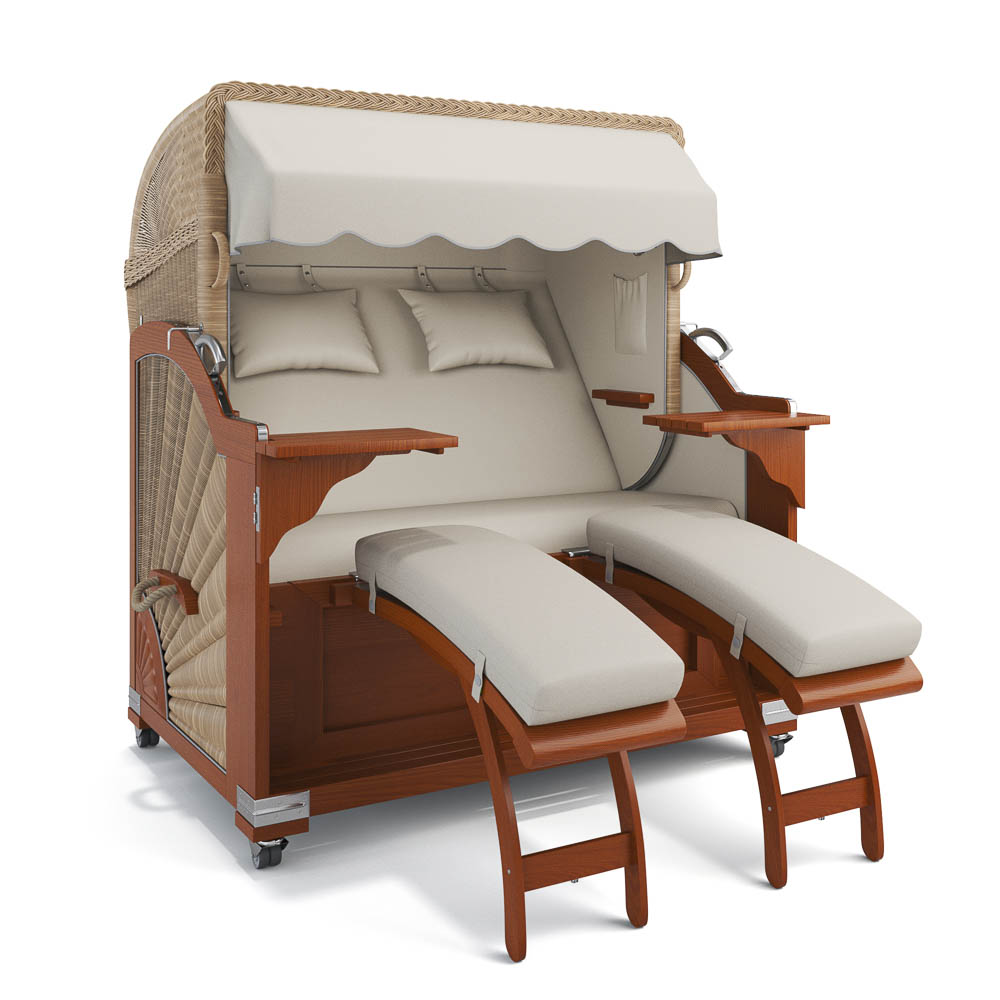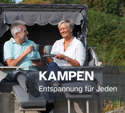 Mit dem Strandkorb Kampen verwandeln Sie Garten, Terrasse oder Balkon in die perfekte Urlaubs-Oase. Genießen Sie entspannte Stunden im Grünen mit allem Komfort. Der hochwertige Volllieger überzeugt mit ausgewählten Materialien und vielerlei Annehmlichkeiten. Er wird aus robustem Teak-Holz und edlem PE-Geflecht gefertigt und ist wind- und wasserfest. Die im Lieferumfang enthaltene Abdeckhaube bietet Ihrem Outdoor-Möbel dauerhaften Wetterschutz. Für den Wellness-Faktor sorgen bequeme Polster, höhenverstellbare Fußablagen und der einfach zu verstellende Oberkorb. Mit dem praktischen Duo-Lifter wechseln Sie komfortabel zwischen Sitz- und Liegeposition. Die schwenkbaren Notebook-Tische bieten ausreichend Platz für Laptop, Bücher, Snacks und Getränke und in den Taschen an den Seiten des Strandkorbs lassen sich Zeitschriften und Smartphone verstauen. Ihren Traumstoff für den Strandkorb können Sie aus über 100 verschiedenen Stoffen wählen und dann heißt es: Platz nehmen und relaxen.