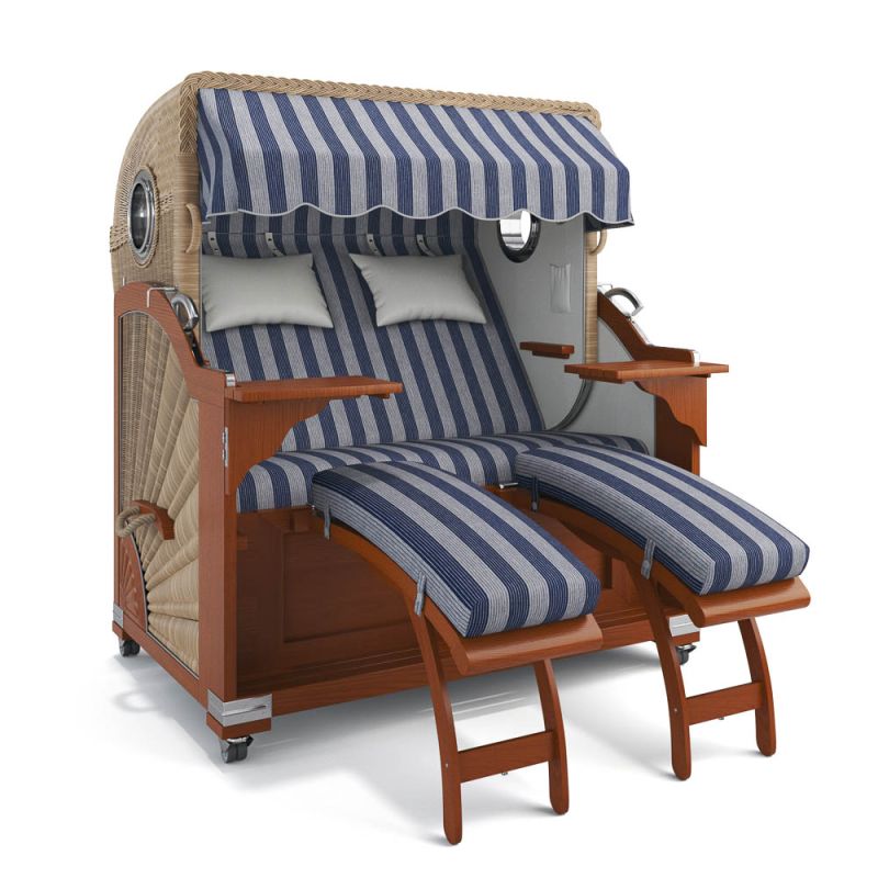 ausziehbare Fußstützen: Ausziehbare Fußstützen sind besonders praktisch, da sie ohne Montage schnell einsatzbereit sind. Ihr klassisches Design fügt sich harmonisch in die Optik des Strandkorbs ein und erinnert an traditionelle Strandkorbmodelle.