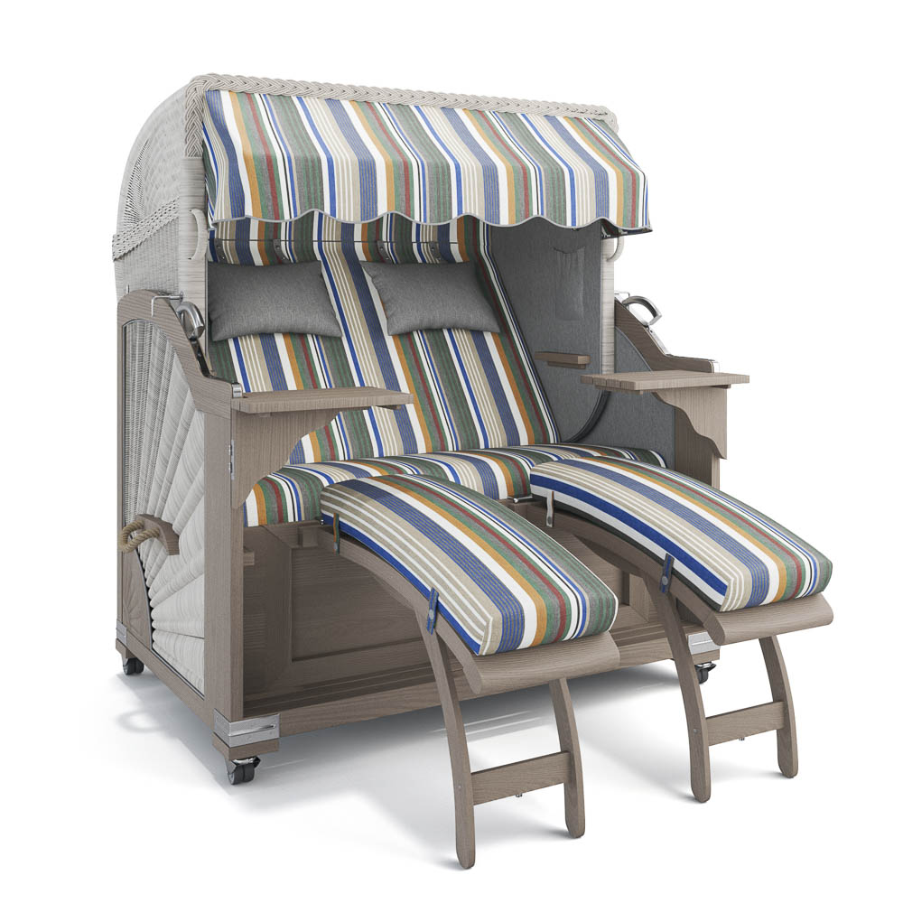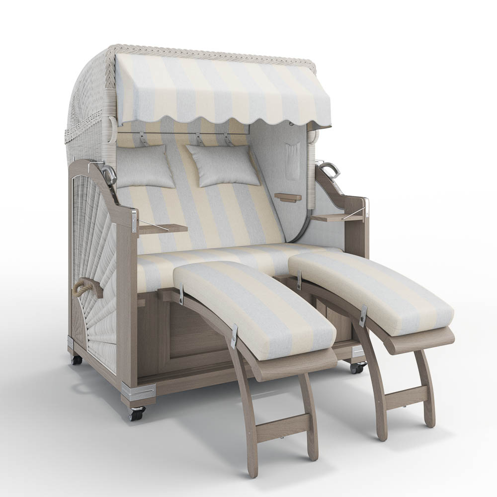 ausziehbare Fußstützen: Ausziehbare Fußstützen sind besonders praktisch, da sie ohne Montage schnell einsatzbereit sind. Ihr klassisches Design fügt sich harmonisch in die Optik des Strandkorbs ein und erinnert an traditionelle Strandkorbmodelle.