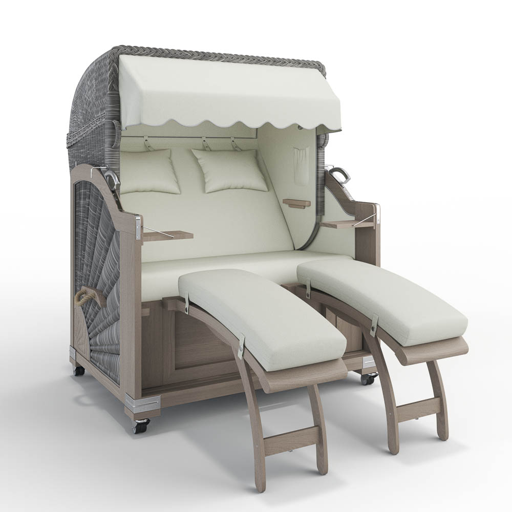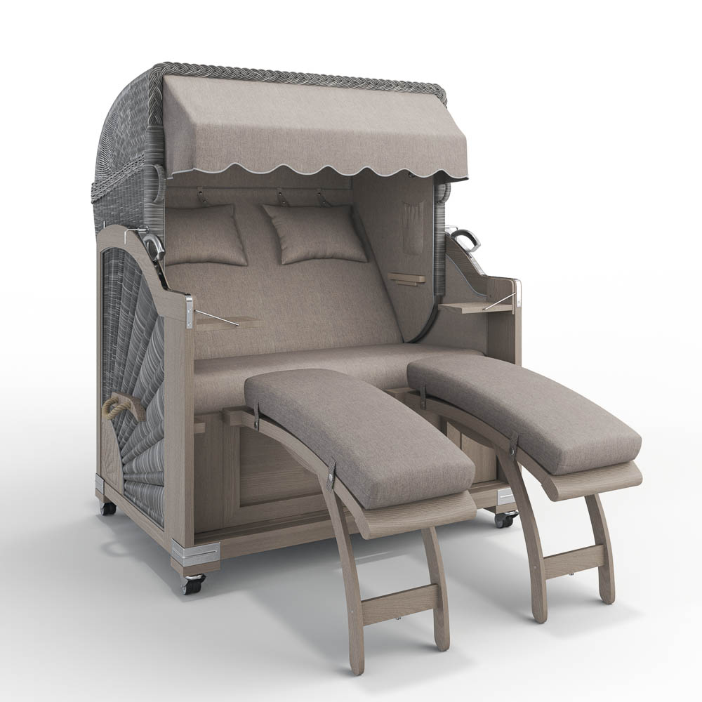 einhängbare Fußstützen: Unser Modell „Keitum“ ist mit höhenverstellbaren, einhängbaren Fußstützen ausgestattet. Der Bezug der Fußstützen ist abnehmbar und daher leicht zu reinigen. Zusätzlich verfügen diese Modelle über praktischen Stauraum unter der Sitzbank, in dem die Fußstützen oder die Abdeckhaube verstaut werden können. Auch der Bezug der Sitzbank lässt sich bequem abnehmen.