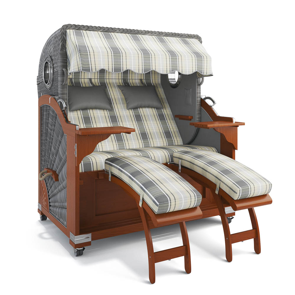 Der Strandkorb Keitum wird in drei exklusiven Holzvarianten angeboten: Mahagoni, Teak und Teak Vintage. Alle Hölzer stammen aus zertifiziertem, nachhaltigem Anbau und stehen für höchste Qualität.
