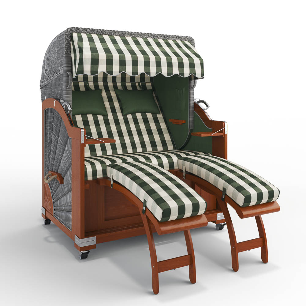 Der Strandkorb Keitum wird in drei exklusiven Holzvarianten angeboten: Mahagoni, Teak und Teak Vintage. Alle Hölzer stammen aus zertifiziertem, nachhaltigem Anbau und stehen für höchste Qualität.
