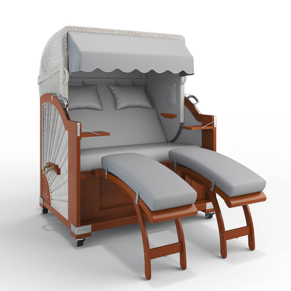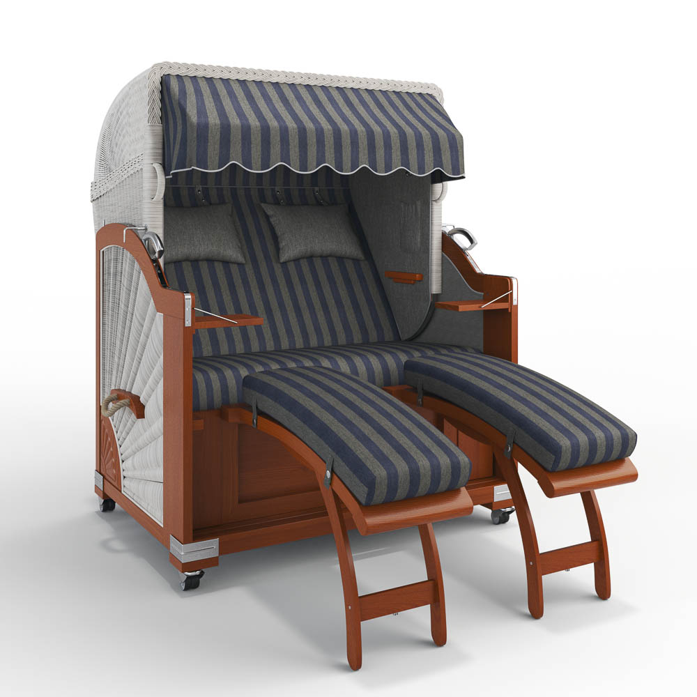 einhängbare Fußstützen: Unser Modell „Keitum“ ist mit höhenverstellbaren, einhängbaren Fußstützen ausgestattet. Der Bezug der Fußstützen ist abnehmbar und daher leicht zu reinigen. Zusätzlich verfügen diese Modelle über praktischen Stauraum unter der Sitzbank, in dem die Fußstützen oder die Abdeckhaube verstaut werden können. Auch der Bezug der Sitzbank lässt sich bequem abnehmen.