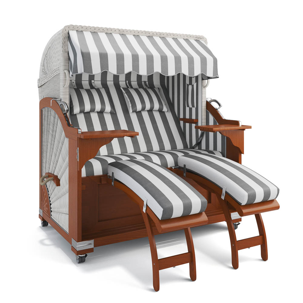 Der Strandkorb Keitum wird in drei exklusiven Holzvarianten angeboten: Mahagoni, Teak und Teak Vintage. Alle Hölzer stammen aus zertifiziertem, nachhaltigem Anbau und stehen für höchste Qualität.