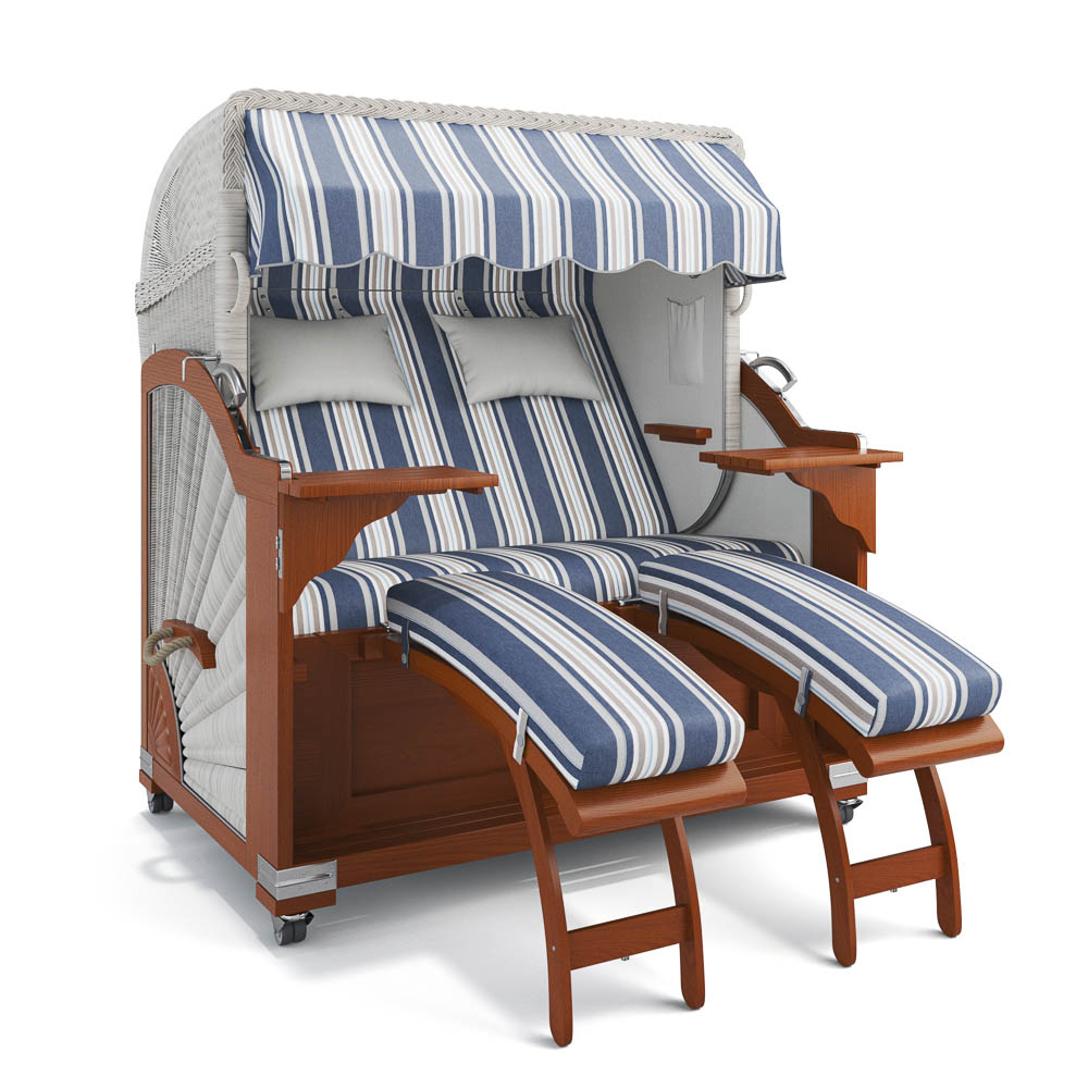 Mit diesem Strandkorb erfüllen Sie sich jeden Tag Ihre Urlaubsträume. Genießen Sie maritimes Flair in Ihrem Garten, auf der Terrasse oder auf dem Balkon. Auch im Wintergarten ist das Strandkorb-Modell „Keitum“ der ideale Platz zum Entspannen. Durch die geschwungene Form, das hochwertige Mahagoniholz und die hochglanzpolierten Edelstahlbeschläge wirkt das Outdoor-Möbel zudem als dekorativer Blickfang. Mit exquisiten Details wie Sonnengeflecht und Ornament-Schnitzerei zeigt sich der Premium-Strandkorb von seiner schönsten Seite. Neben zwei Klapptischen und höhenverstellbaren Fußablagen zum Einhängen gehören auch zwei bequeme Nackenkissen zum Lieferumfang, ebenso wie Abdeckhaube, Duo-Lifter und Rollen. Freuen Sie sich auf entspannte Stunden in Ihrem eigenen Strandkorb zu Hause.