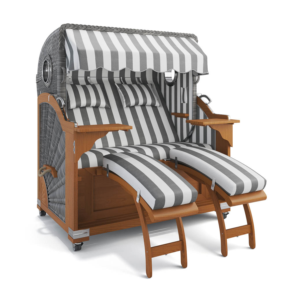 einhängbare Fußstützen: Unser Modell „Keitum“ ist mit höhenverstellbaren, einhängbaren Fußstützen ausgestattet. Der Bezug der Fußstützen ist abnehmbar und daher leicht zu reinigen. Zusätzlich verfügen diese Modelle über praktischen Stauraum unter der Sitzbank, in dem die Fußstützen oder die Abdeckhaube verstaut werden können. Auch der Bezug der Sitzbank lässt sich bequem abnehmen.