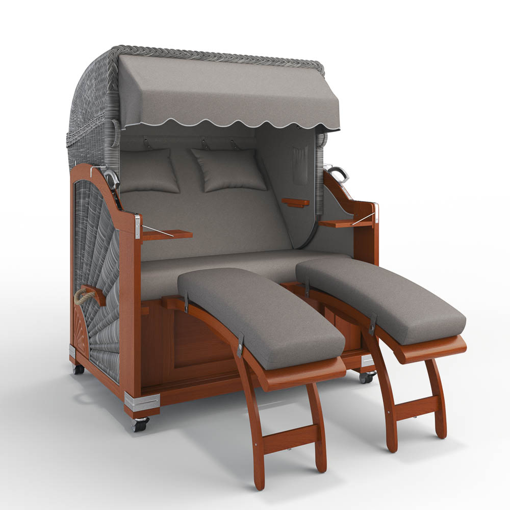 Der Strandkorb Keitum wird in drei exklusiven Holzvarianten angeboten: Mahagoni, Teak und Teak Vintage. Alle Hölzer stammen aus zertifiziertem, nachhaltigem Anbau und stehen für höchste Qualität.