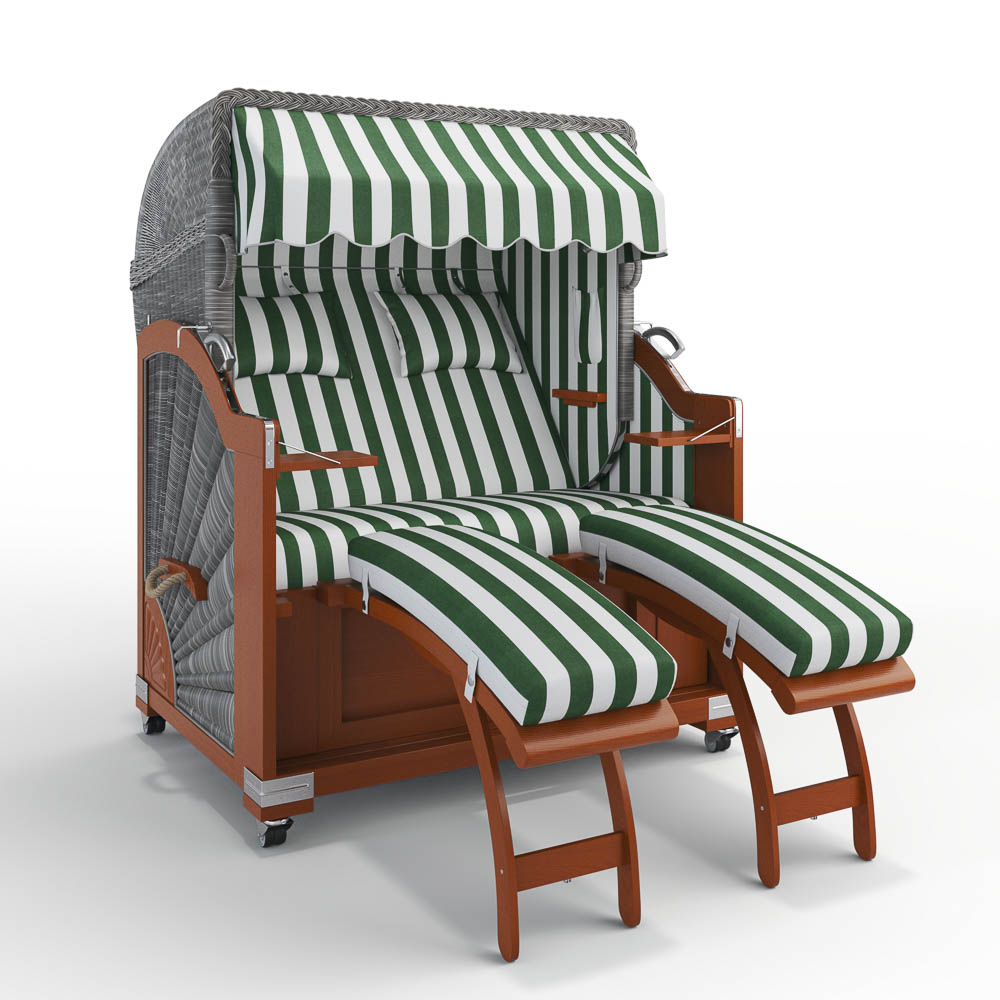 Der Strandkorb Keitum wird in drei exklusiven Holzvarianten angeboten: Mahagoni, Teak und Teak Vintage. Alle Hölzer stammen aus zertifiziertem, nachhaltigem Anbau und stehen für höchste Qualität.