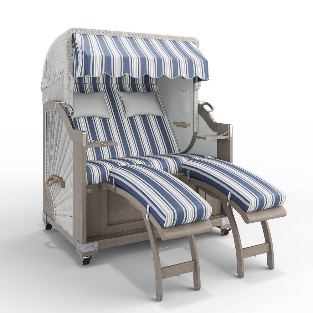 einhängbare Fußstützen: Unser Modell „Keitum“ ist mit höhenverstellbaren, einhängbaren Fußstützen ausgestattet. Der Bezug der Fußstützen ist abnehmbar und daher leicht zu reinigen. Zusätzlich verfügen diese Modelle über praktischen Stauraum unter der Sitzbank, in dem die Fußstützen oder die Abdeckhaube verstaut werden können. Auch der Bezug der Sitzbank lässt sich bequem abnehmen.