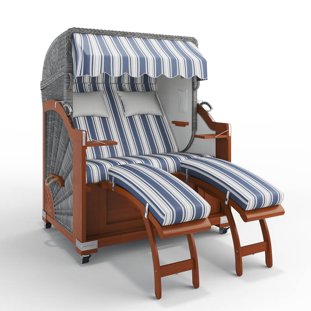 Mit diesem Strandkorb erfüllen Sie sich jeden Tag Ihre Urlaubsträume. Genießen Sie maritimes Flair in Ihrem Garten, auf der Terrasse oder auf dem Balkon. Auch im Wintergarten ist das Strandkorb-Modell „Keitum“ der ideale Platz zum Entspannen. Durch die geschwungene Form, das hochwertige Mahagoniholz und die hochglanzpolierten Edelstahlbeschläge wirkt das Outdoor-Möbel zudem als dekorativer Blickfang. Mit exquisiten Details wie Sonnengeflecht und Ornament-Schnitzerei zeigt sich der Premium-Strandkorb von seiner schönsten Seite. Neben zwei Klapptischen und höhenverstellbaren Fußablagen zum Einhängen gehören auch zwei bequeme Nackenkissen zum Lieferumfang, ebenso wie Abdeckhaube, Duo-Lifter und Rollen. Freuen Sie sich auf entspannte Stunden in Ihrem eigenen Strandkorb zu Hause.