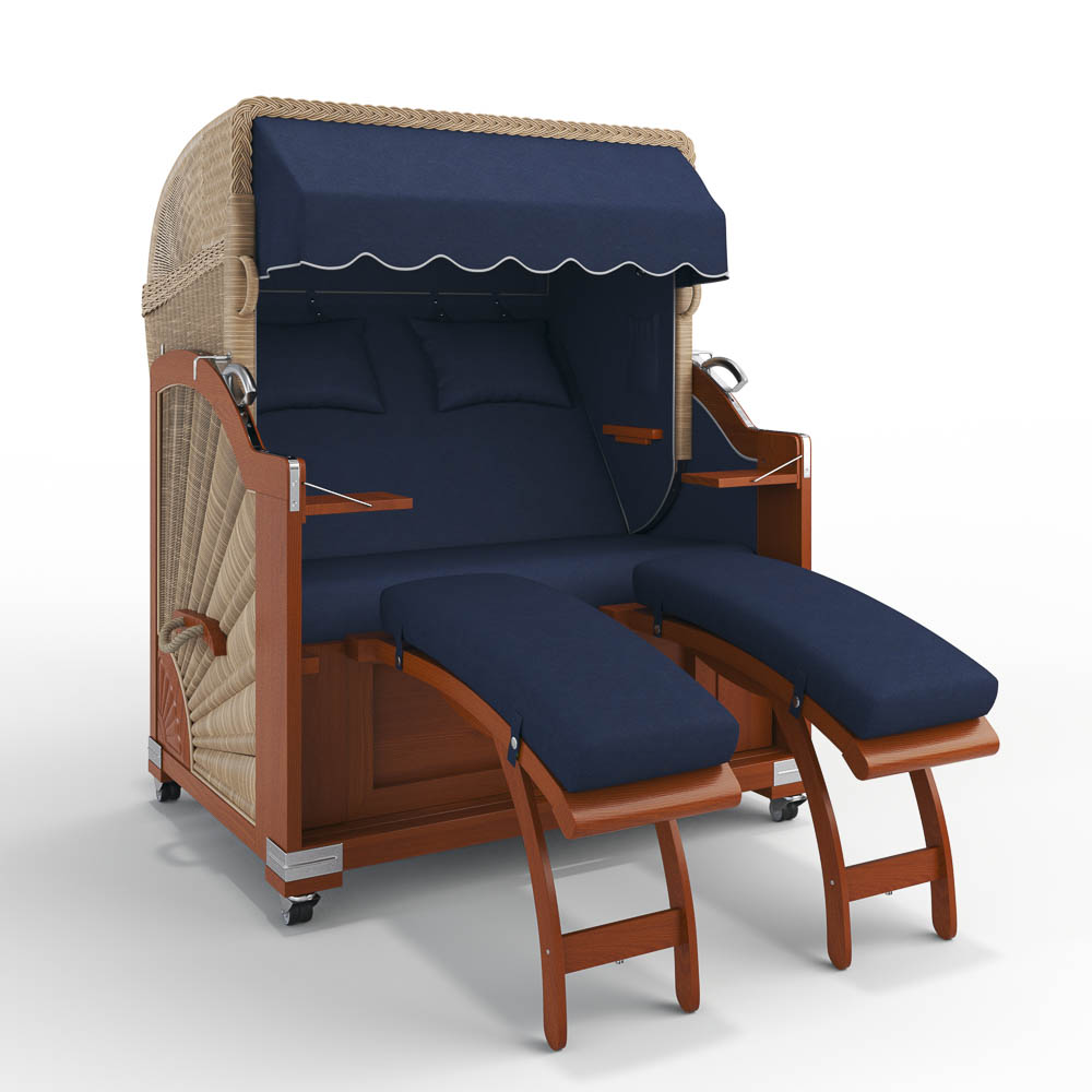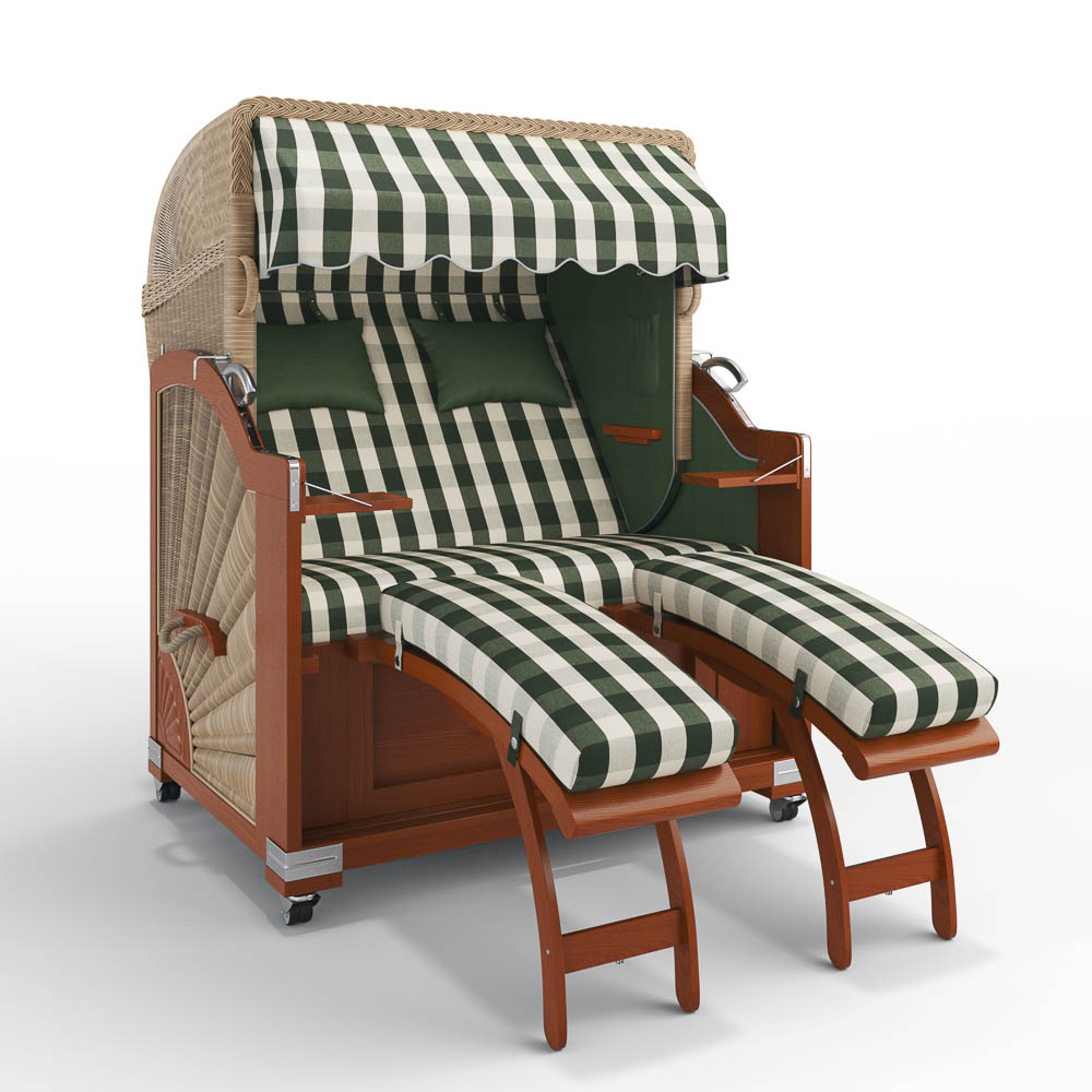 Mit diesem Strandkorb erfüllen Sie sich jeden Tag Ihre Urlaubsträume. Genießen Sie maritimes Flair in Ihrem Garten, auf der Terrasse oder auf dem Balkon. Auch im Wintergarten ist das Strandkorb-Modell „Keitum“ der ideale Platz zum Entspannen. Durch die geschwungene Form, das hochwertige Mahagoniholz und die hochglanzpolierten Edelstahlbeschläge wirkt das Outdoor-Möbel zudem als dekorativer Blickfang. Mit exquisiten Details wie Sonnengeflecht und Ornament-Schnitzerei zeigt sich der Premium-Strandkorb von seiner schönsten Seite. Neben zwei Klapptischen und höhenverstellbaren Fußablagen zum Einhängen gehören auch zwei bequeme Nackenkissen zum Lieferumfang, ebenso wie Abdeckhaube, Duo-Lifter und Rollen. Freuen Sie sich auf entspannte Stunden in Ihrem eigenen Strandkorb zu Hause.
