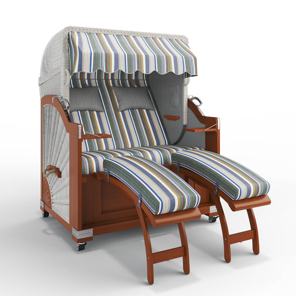 Der Strandkorb Keitum wird in drei exklusiven Holzvarianten angeboten: Mahagoni, Teak und Teak Vintage. Alle Hölzer stammen aus zertifiziertem, nachhaltigem Anbau und stehen für höchste Qualität.