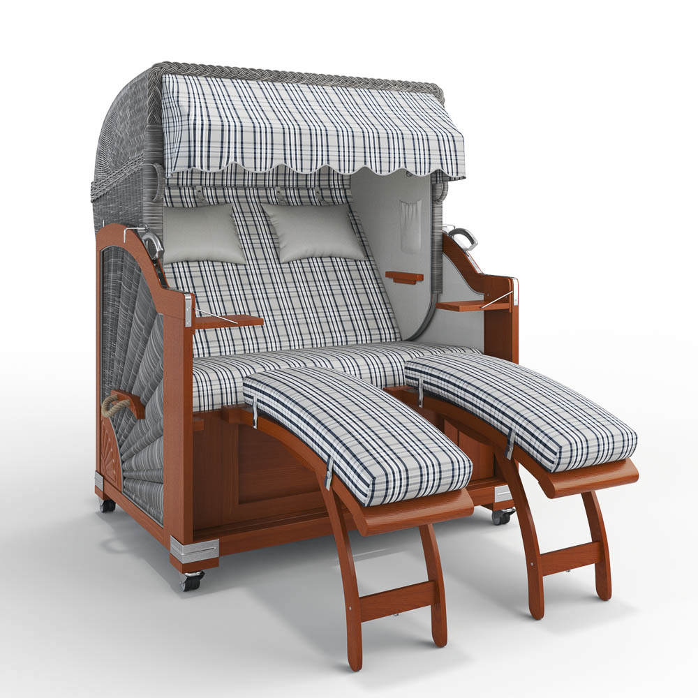 Mit diesem Strandkorb erfüllen Sie sich jeden Tag Ihre Urlaubsträume. Genießen Sie maritimes Flair in Ihrem Garten, auf der Terrasse oder auf dem Balkon. Auch im Wintergarten ist das Strandkorb-Modell „Keitum“ der ideale Platz zum Entspannen. Durch die geschwungene Form, das hochwertige Mahagoniholz und die hochglanzpolierten Edelstahlbeschläge wirkt das Outdoor-Möbel zudem als dekorativer Blickfang. Mit exquisiten Details wie Sonnengeflecht und Ornament-Schnitzerei zeigt sich der Premium-Strandkorb von seiner schönsten Seite. Neben zwei Klapptischen und höhenverstellbaren Fußablagen zum Einhängen gehören auch zwei bequeme Nackenkissen zum Lieferumfang, ebenso wie Abdeckhaube, Duo-Lifter und Rollen. Freuen Sie sich auf entspannte Stunden in Ihrem eigenen Strandkorb zu Hause.