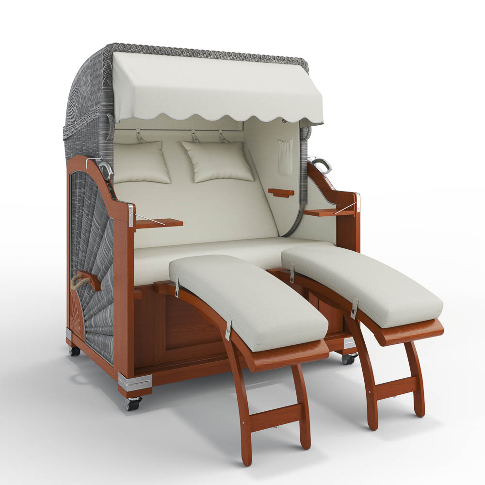 Der Strandkorb Keitum wird in drei exklusiven Holzvarianten angeboten: Mahagoni, Teak und Teak Vintage. Alle Hölzer stammen aus zertifiziertem, nachhaltigem Anbau und stehen für höchste Qualität.