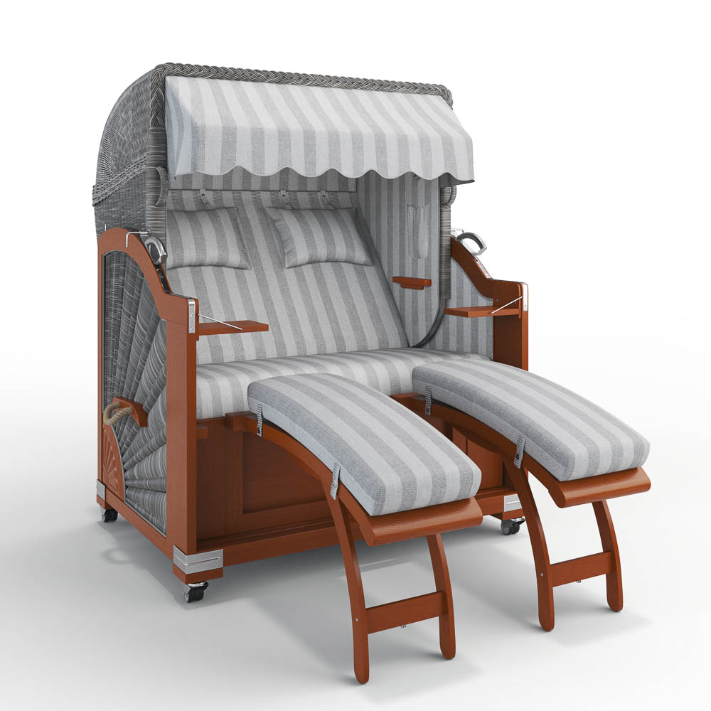 einhängbare Fußstützen: Unser Modell „Keitum“ ist mit höhenverstellbaren, einhängbaren Fußstützen ausgestattet. Der Bezug der Fußstützen ist abnehmbar und daher leicht zu reinigen. Zusätzlich verfügen diese Modelle über praktischen Stauraum unter der Sitzbank, in dem die Fußstützen oder die Abdeckhaube verstaut werden können. Auch der Bezug der Sitzbank lässt sich bequem abnehmen.