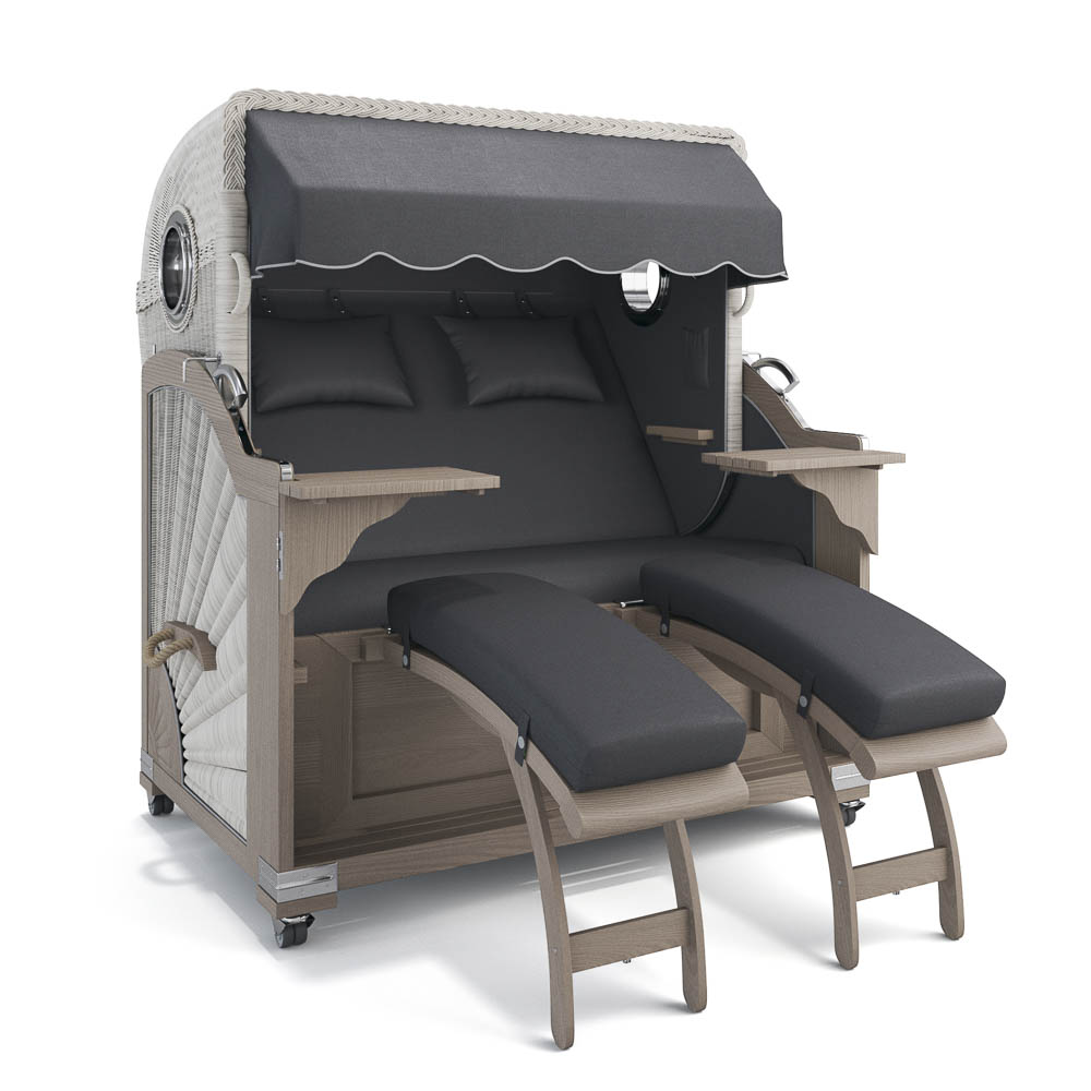 Unser Modell Keitum bietet zwei abnehmbare Fußstützen, die sich bequem in zwei verschiedene Höhen verstellen lassen. So können Sie und Ihr Partner individuell entscheiden, wie hoch die Fußstützen sein sollen. Für zusätzlichen Komfort können die Fußstützen bei Bedarf einfach im Stauraum unter der Sitzfläche verstaut werden.