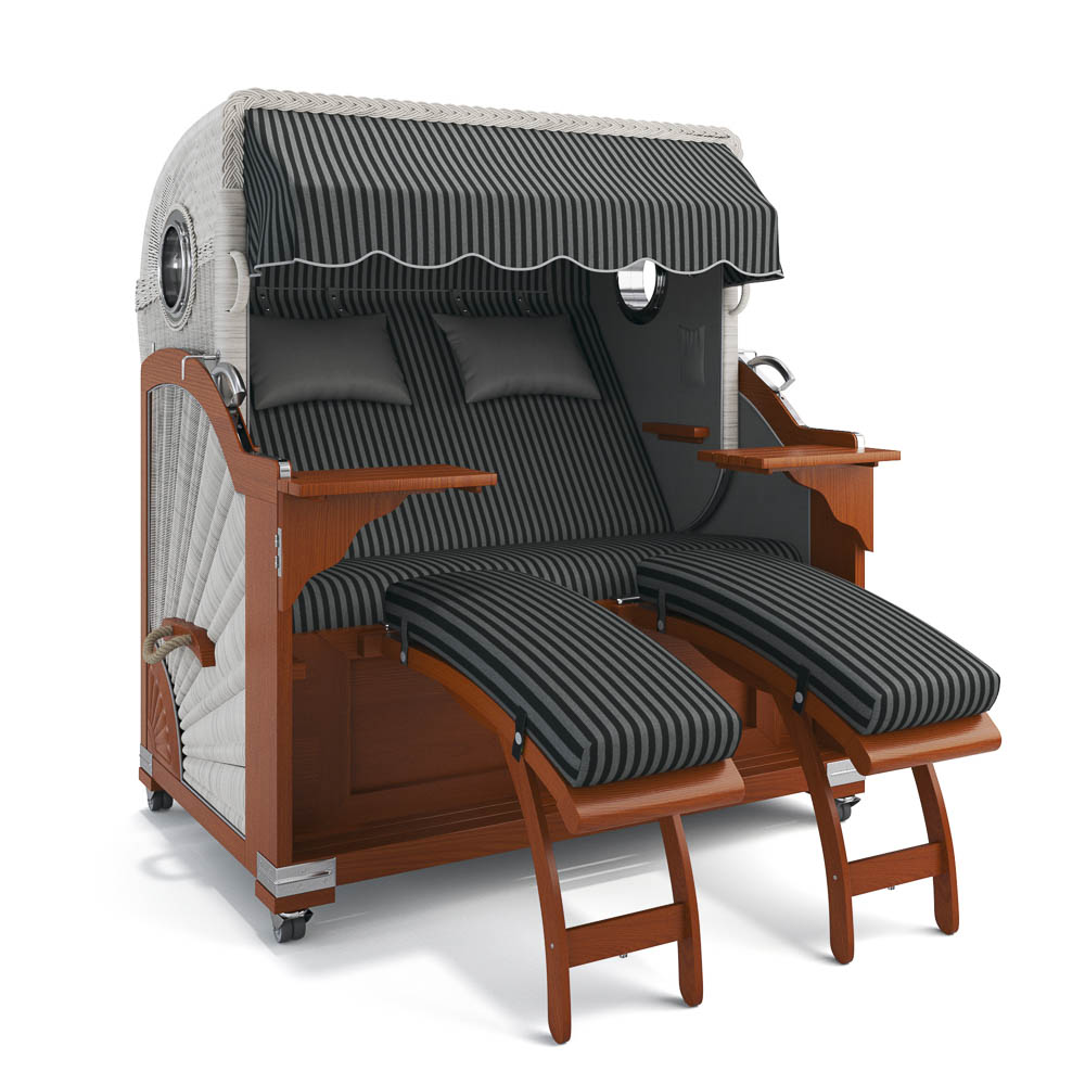 einhängbare Fußstützen: Unser Modell „Keitum“ ist mit höhenverstellbaren, einhängbaren Fußstützen ausgestattet. Der Bezug der Fußstützen ist abnehmbar und daher leicht zu reinigen. Zusätzlich verfügen diese Modelle über praktischen Stauraum unter der Sitzbank, in dem die Fußstützen oder die Abdeckhaube verstaut werden können. Auch der Bezug der Sitzbank lässt sich bequem abnehmen.