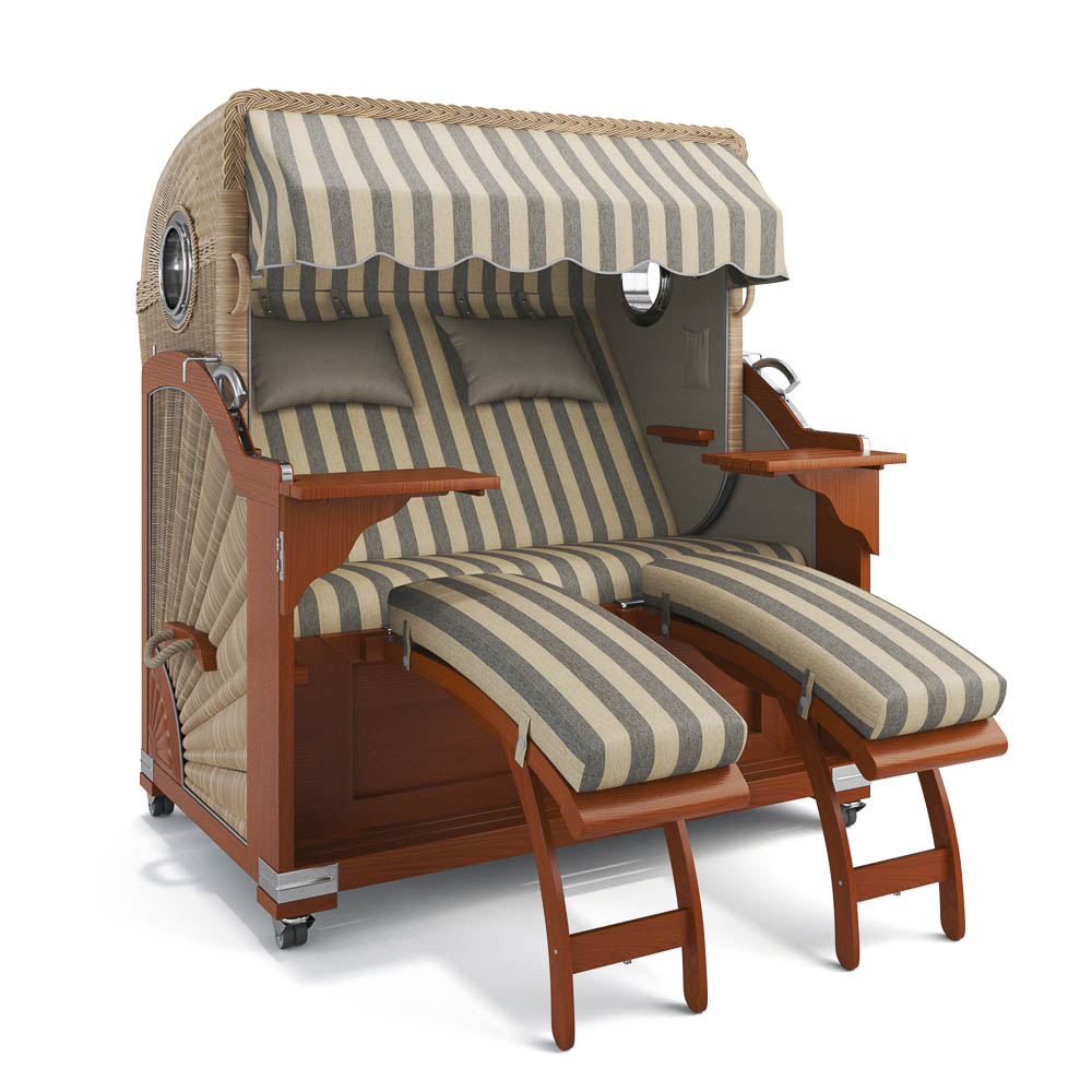 Der Strandkorb Keitum wird in drei exklusiven Holzvarianten angeboten: Mahagoni, Teak und Teak Vintage. Alle Hölzer stammen aus zertifiziertem, nachhaltigem Anbau und stehen für höchste Qualität.