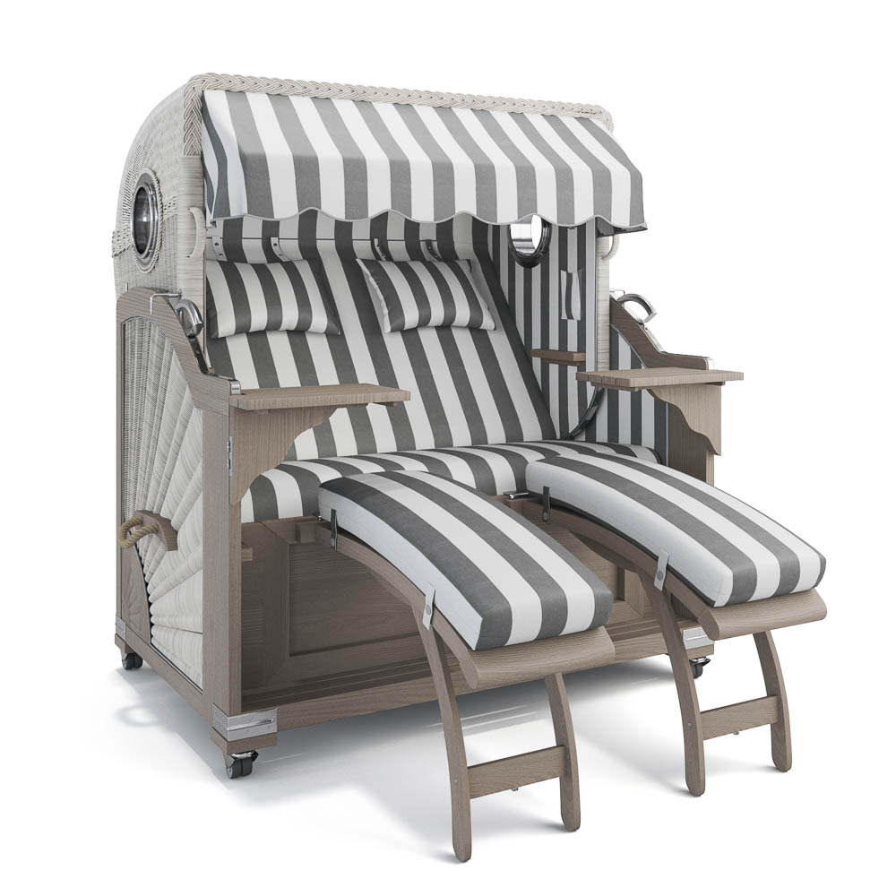 einhängbare Fußstützen: Unser Modell „Keitum“ ist mit höhenverstellbaren, einhängbaren Fußstützen ausgestattet. Der Bezug der Fußstützen ist abnehmbar und daher leicht zu reinigen. Zusätzlich verfügen diese Modelle über praktischen Stauraum unter der Sitzbank, in dem die Fußstützen oder die Abdeckhaube verstaut werden können. Auch der Bezug der Sitzbank lässt sich bequem abnehmen.