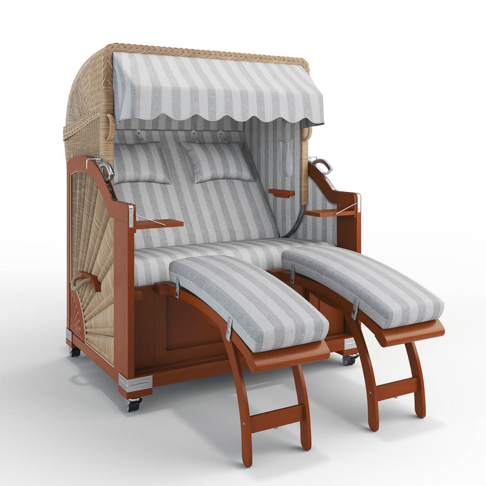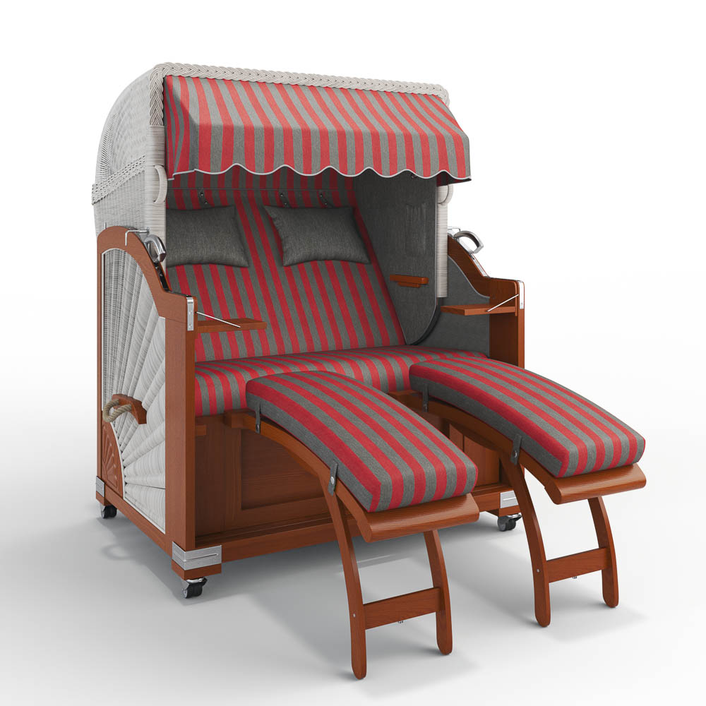 Der Strandkorb Keitum wird in drei exklusiven Holzvarianten angeboten: Mahagoni, Teak und Teak Vintage. Alle Hölzer stammen aus zertifiziertem, nachhaltigem Anbau und stehen für höchste Qualität.