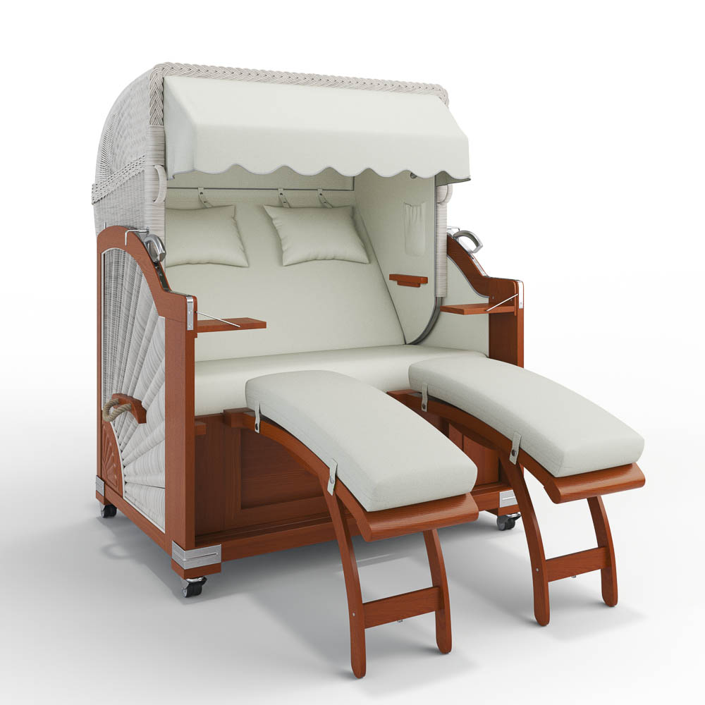 einhängbare Fußstützen: Unser Modell „Keitum“ ist mit höhenverstellbaren, einhängbaren Fußstützen ausgestattet. Der Bezug der Fußstützen ist abnehmbar und daher leicht zu reinigen. Zusätzlich verfügen diese Modelle über praktischen Stauraum unter der Sitzbank, in dem die Fußstützen oder die Abdeckhaube verstaut werden können. Auch der Bezug der Sitzbank lässt sich bequem abnehmen.