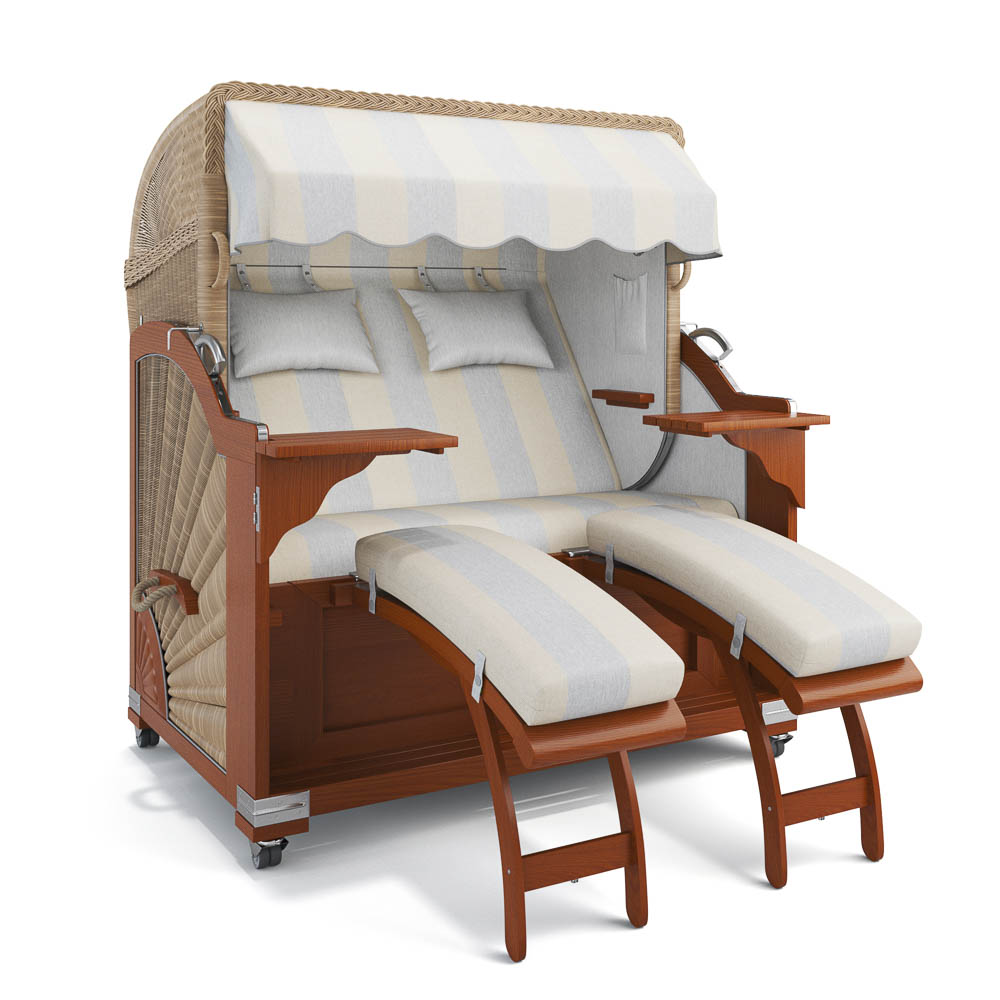 Mit diesem Strandkorb erfüllen Sie sich jeden Tag Ihre Urlaubsträume. Genießen Sie maritimes Flair in Ihrem Garten, auf der Terrasse oder auf dem Balkon. Auch im Wintergarten ist das Strandkorb-Modell „Keitum“ der ideale Platz zum Entspannen. Durch die geschwungene Form, das hochwertige Mahagoniholz und die hochglanzpolierten Edelstahlbeschläge wirkt das Outdoor-Möbel zudem als dekorativer Blickfang. Mit exquisiten Details wie Sonnengeflecht und Ornament-Schnitzerei zeigt sich der Premium-Strandkorb von seiner schönsten Seite. Neben zwei Klapptischen und höhenverstellbaren Fußablagen zum Einhängen gehören auch zwei bequeme Nackenkissen zum Lieferumfang, ebenso wie Abdeckhaube, Duo-Lifter und Rollen. Freuen Sie sich auf entspannte Stunden in Ihrem eigenen Strandkorb zu Hause.