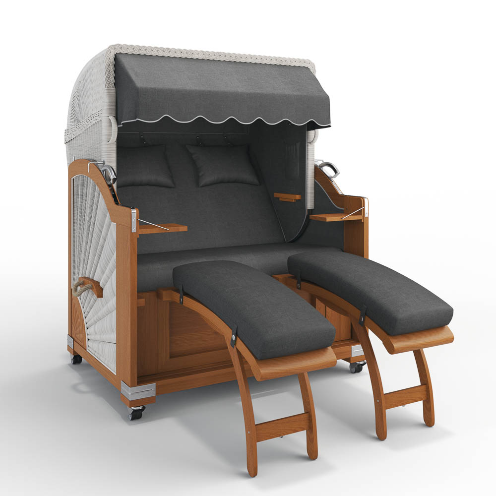 Unser Modell Keitum bietet zwei abnehmbare Fußstützen, die sich bequem in zwei verschiedene Höhen verstellen lassen. So können Sie und Ihr Partner individuell entscheiden, wie hoch die Fußstützen sein sollen. Für zusätzlichen Komfort können die Fußstützen bei Bedarf einfach im Stauraum unter der Sitzfläche verstaut werden.