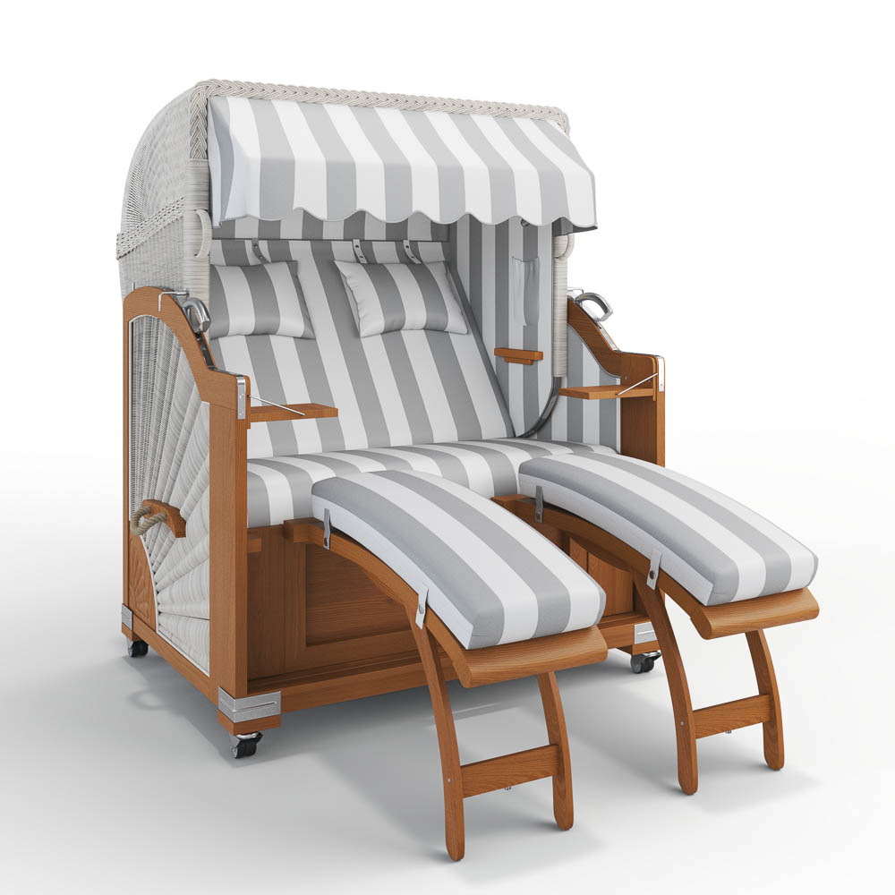 einhängbare Fußstützen: Unser Modell „Keitum“ ist mit höhenverstellbaren, einhängbaren Fußstützen ausgestattet. Der Bezug der Fußstützen ist abnehmbar und daher leicht zu reinigen. Zusätzlich verfügen diese Modelle über praktischen Stauraum unter der Sitzbank, in dem die Fußstützen oder die Abdeckhaube verstaut werden können. Auch der Bezug der Sitzbank lässt sich bequem abnehmen.