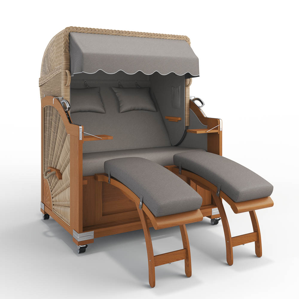 einhängbare Fußstützen: Unser Modell „Keitum“ ist mit höhenverstellbaren, einhängbaren Fußstützen ausgestattet. Der Bezug der Fußstützen ist abnehmbar und daher leicht zu reinigen. Zusätzlich verfügen diese Modelle über praktischen Stauraum unter der Sitzbank, in dem die Fußstützen oder die Abdeckhaube verstaut werden können. Auch der Bezug der Sitzbank lässt sich bequem abnehmen.