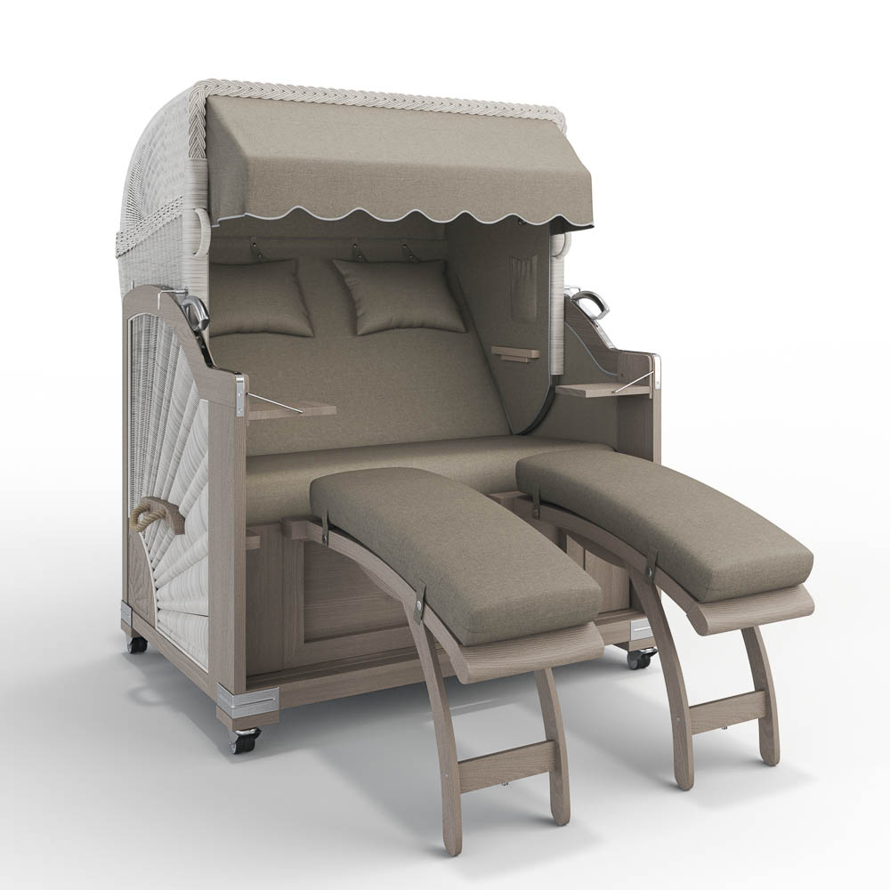 einhängbare Fußstützen: Unser Modell „Keitum“ ist mit höhenverstellbaren, einhängbaren Fußstützen ausgestattet. Der Bezug der Fußstützen ist abnehmbar und daher leicht zu reinigen. Zusätzlich verfügen diese Modelle über praktischen Stauraum unter der Sitzbank, in dem die Fußstützen oder die Abdeckhaube verstaut werden können. Auch der Bezug der Sitzbank lässt sich bequem abnehmen.