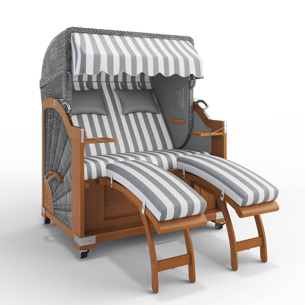 einhängbare Fußstützen: Unser Modell „Keitum“ ist mit höhenverstellbaren, einhängbaren Fußstützen ausgestattet. Der Bezug der Fußstützen ist abnehmbar und daher leicht zu reinigen. Zusätzlich verfügen diese Modelle über praktischen Stauraum unter der Sitzbank, in dem die Fußstützen oder die Abdeckhaube verstaut werden können. Auch der Bezug der Sitzbank lässt sich bequem abnehmen.