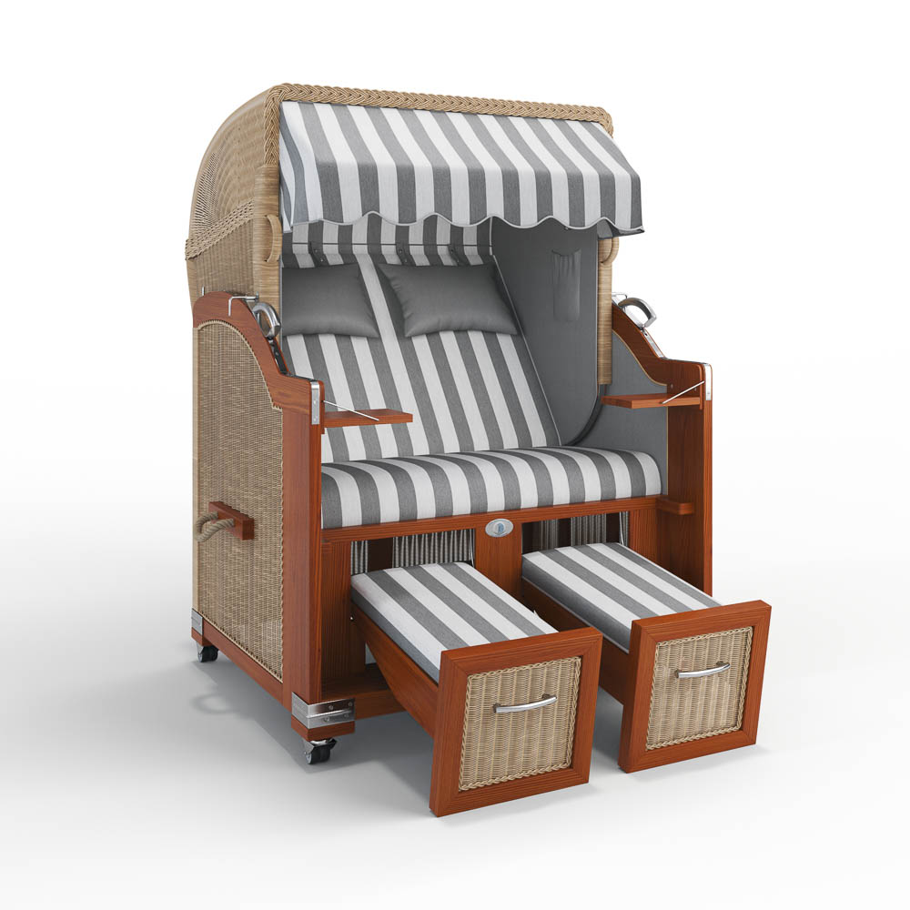 Der Strandkorb Keitum wird in drei exklusiven Holzvarianten angeboten: Mahagoni, Teak und Teak Vintage. Alle Hölzer stammen aus zertifiziertem, nachhaltigem Anbau und stehen für höchste Qualität.