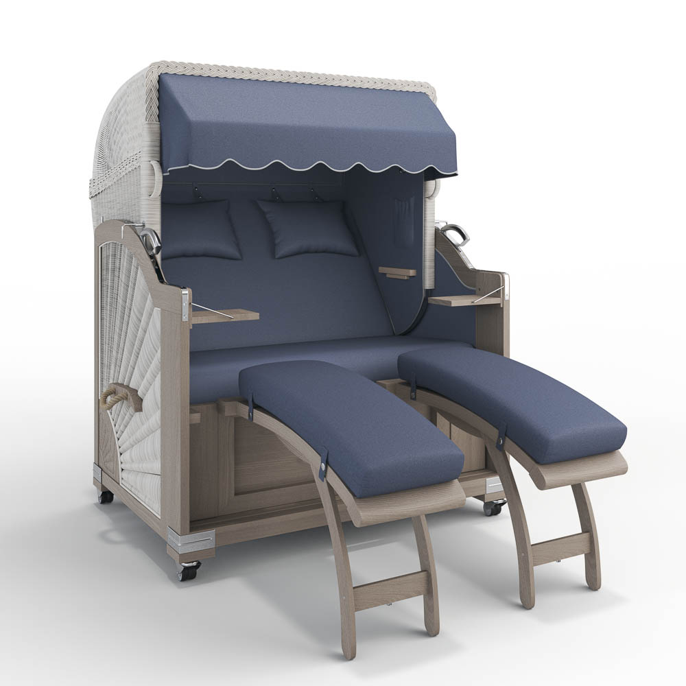 einhängbare Fußstützen: Unser Modell „Keitum“ ist mit höhenverstellbaren, einhängbaren Fußstützen ausgestattet. Der Bezug der Fußstützen ist abnehmbar und daher leicht zu reinigen. Zusätzlich verfügen diese Modelle über praktischen Stauraum unter der Sitzbank, in dem die Fußstützen oder die Abdeckhaube verstaut werden können. Auch der Bezug der Sitzbank lässt sich bequem abnehmen.