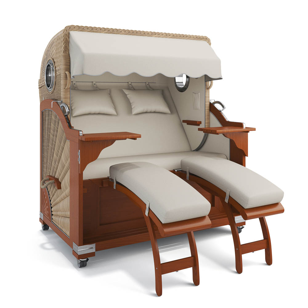 Der Strandkorb Keitum wird in drei exklusiven Holzvarianten angeboten: Mahagoni, Teak und Teak Vintage. Alle Hölzer stammen aus zertifiziertem, nachhaltigem Anbau und stehen für höchste Qualität.