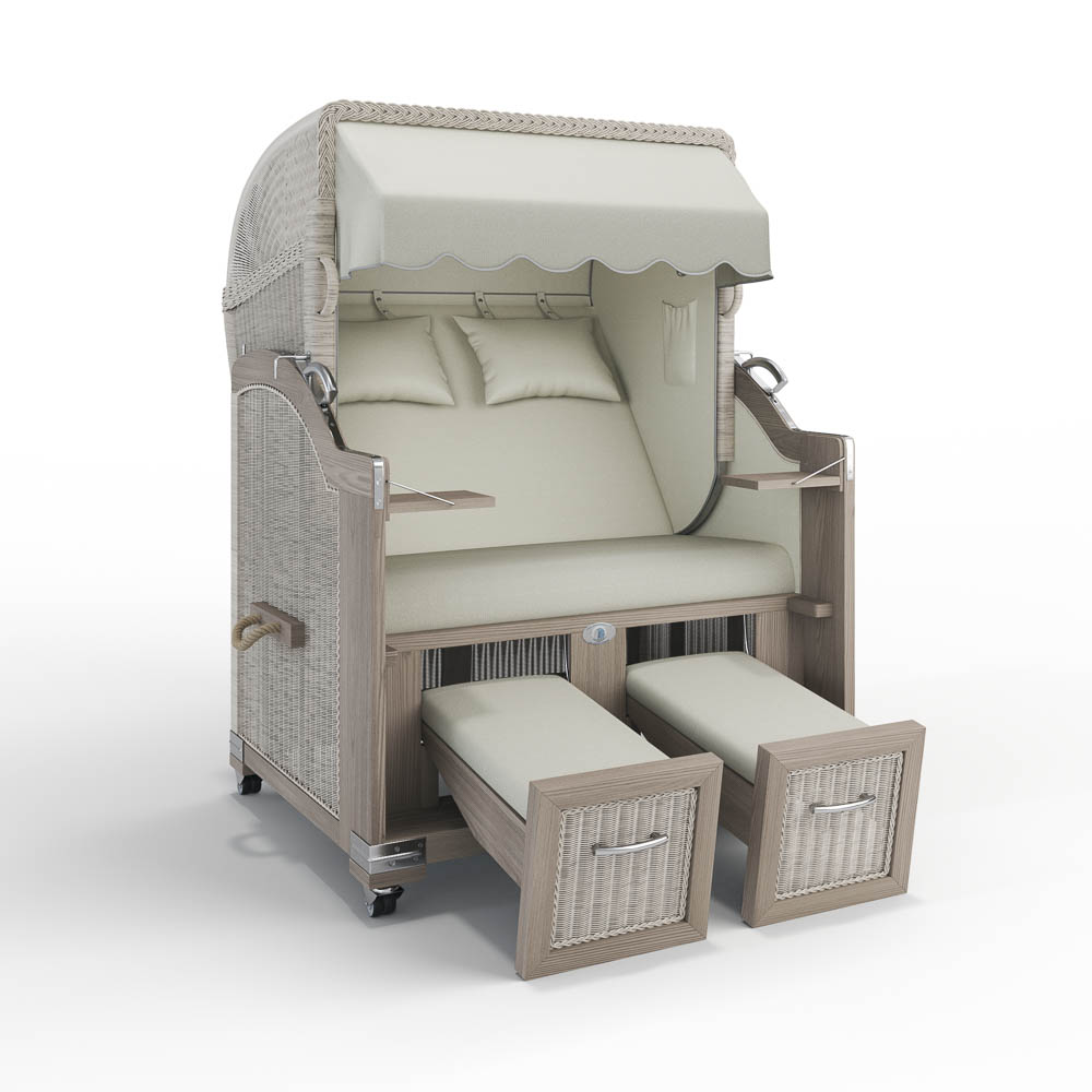 Unser Modell Landhaus Sylt überzeugt mit zwei herausziehbaren Fußablagen, die bei Bedarf schnell und einfach genutzt werden können. Sie lassen sich mit einem Handgriff herausziehen, um entspannt die Beine hochzulegen, und ebenso mühelos wieder einschieben, um Platz zu schaffen. Praktisch und komfortabel!