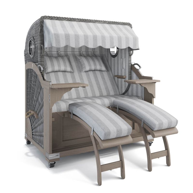 Wer den Landhaus-Stil mag, wird diesen Strandkorb lieben. Das Modell „Landhaus Sylt Teak Vintage“ besteht aus von Hand gebürstetem Teak Vintage-Holz und dem passenden PE-Geflecht „white-washed“. Durch die hellen, freundlichen Farben entsteht eine besondere Atmosphäre, die eine wohltuende Ruhe ausstrahlt. Dekorative Akzente setzen die hochwertigen Polster und Kissen. Wählen Sie Ihren Lieblingsstoff aus der gesamten Stoffkollektion und stellen Sie sich Ihren Strandkorb nach Wunsch zusammen. Neben zwei Klapptischen und zwei herausziehbaren Fußablagen gehören auch zwei bequeme Nackenkissen zum Lieferumfang, ebenso wie Abdeckhaube und Rollen. Der Strandkorb im Landhaus-Stil eignet sich hervorragend für das eigene Zuhause und ist ein beliebtes Strandkorb-Modell für Ferienwohnungen und Ferienhäuser.