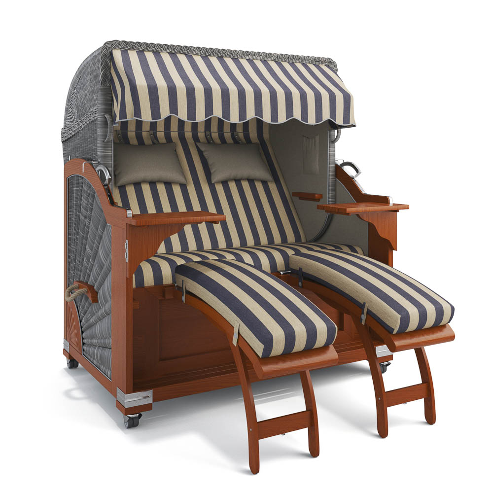 einhängbare Fußstützen: Bei den einhängbaren Fußstützen ist der Bezug  abnehmbar und daher leicht zu reinigen. Zusätzlich verfügen diese Strandkorbmodelle über praktischen Stauraum unter der Sitzbank, in dem die Fußstützen oder die Abdeckhaube verstaut werden können. Auch der Bezug der Sitzbank lässt sich bequem abnehmen.