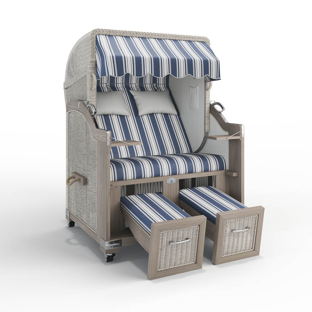 einhängbare Fußstützen: Bei den einhängbaren Fußstützen ist der Bezug  abnehmbar und daher leicht zu reinigen. Zusätzlich verfügen diese Strandkorbmodelle über praktischen Stauraum unter der Sitzbank, in dem die Fußstützen oder die Abdeckhaube verstaut werden können. Auch der Bezug der Sitzbank lässt sich bequem abnehmen.