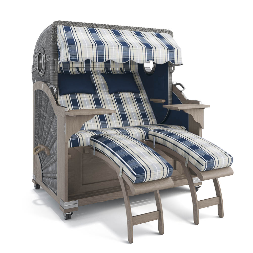 Wer den Landhaus-Stil mag, wird diesen Strandkorb lieben. Das Modell „Landhaus Sylt Teak Vintage“ besteht aus von Hand gebürstetem Teak Vintage-Holz und dem passenden PE-Geflecht „white-washed“. Durch die hellen, freundlichen Farben entsteht eine besondere Atmosphäre, die eine wohltuende Ruhe ausstrahlt. Dekorative Akzente setzen die hochwertigen Polster und Kissen. Wählen Sie Ihren Lieblingsstoff aus der gesamten Stoffkollektion und stellen Sie sich Ihren Strandkorb nach Wunsch zusammen. Neben zwei Klapptischen und zwei herausziehbaren Fußablagen gehören auch zwei bequeme Nackenkissen zum Lieferumfang, ebenso wie Abdeckhaube und Rollen. Der Strandkorb im Landhaus-Stil eignet sich hervorragend für das eigene Zuhause und ist ein beliebtes Strandkorb-Modell für Ferienwohnungen und Ferienhäuser.