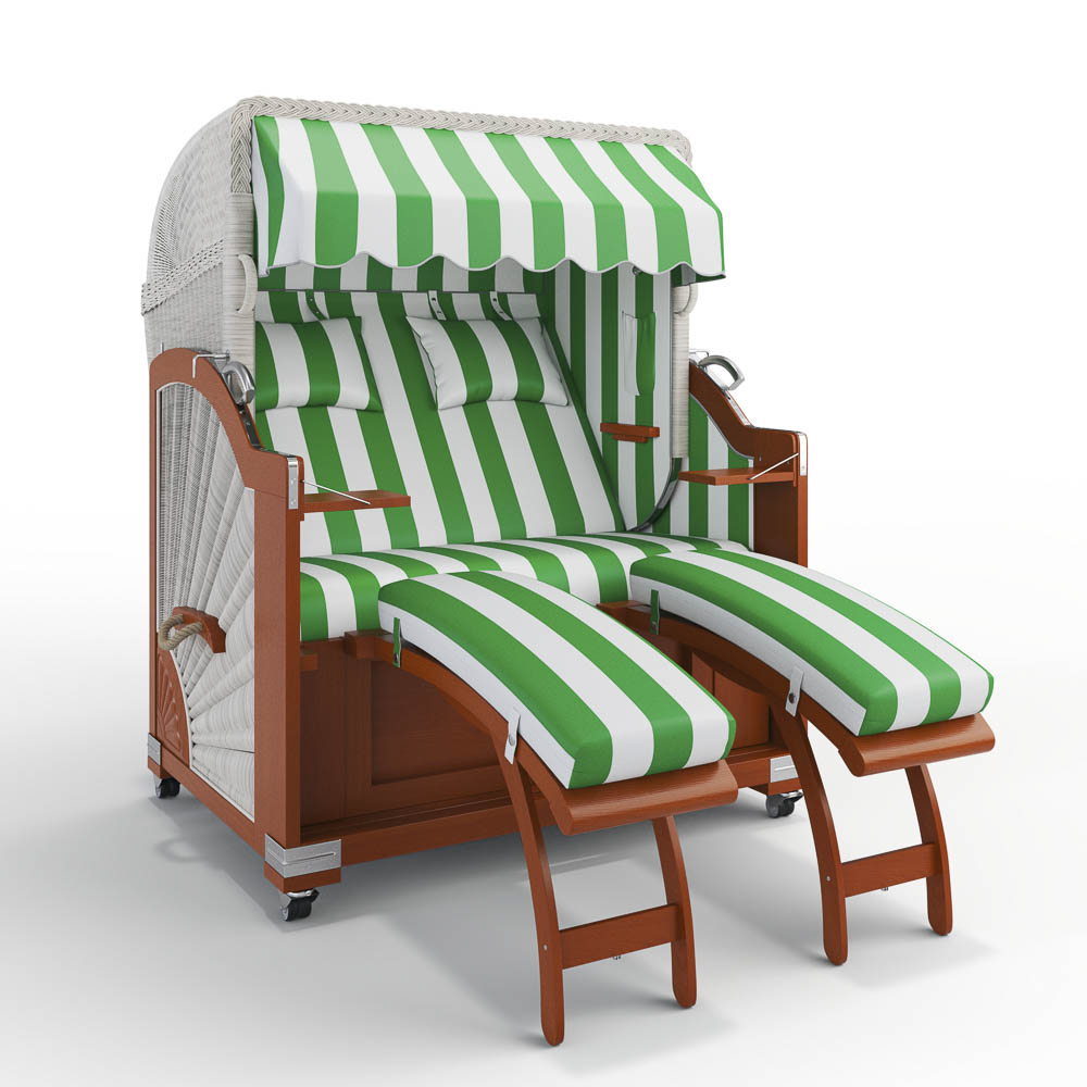 einhängbare Fußstützen: Bei den einhängbaren Fußstützen ist der Bezug  abnehmbar und daher leicht zu reinigen. Zusätzlich verfügen diese Strandkorbmodelle über praktischen Stauraum unter der Sitzbank, in dem die Fußstützen oder die Abdeckhaube verstaut werden können. Auch der Bezug der Sitzbank lässt sich bequem abnehmen.