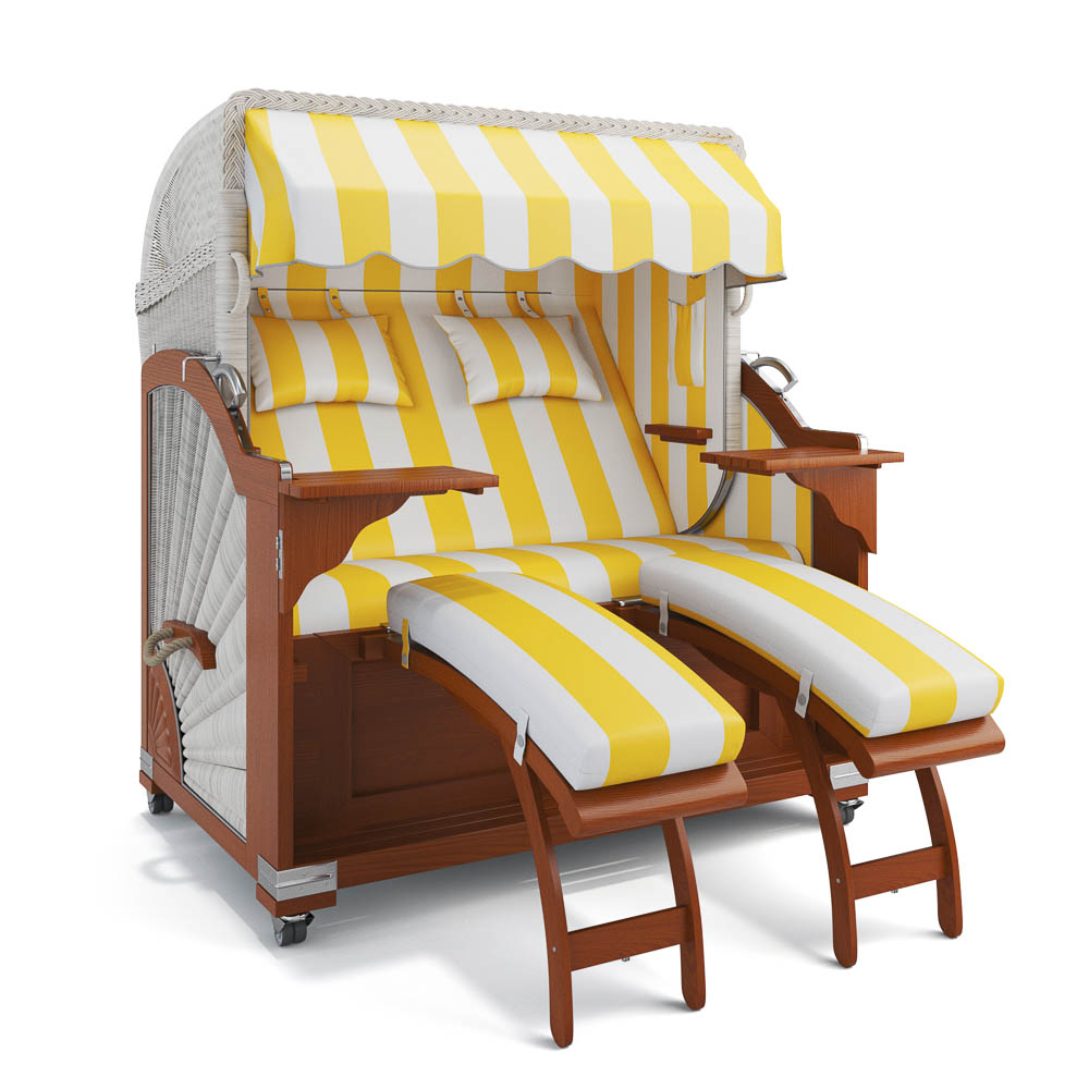 Wer den Landhaus-Stil mag, wird diesen Strandkorb lieben. Das Modell „Landhaus Sylt Teak Vintage“ besteht aus von Hand gebürstetem Teak Vintage-Holz und dem passenden PE-Geflecht „white-washed“. Durch die hellen, freundlichen Farben entsteht eine besondere Atmosphäre, die eine wohltuende Ruhe ausstrahlt. Dekorative Akzente setzen die hochwertigen Polster und Kissen. Wählen Sie Ihren Lieblingsstoff aus der gesamten Stoffkollektion und stellen Sie sich Ihren Strandkorb nach Wunsch zusammen. Neben zwei Klapptischen und zwei herausziehbaren Fußablagen gehören auch zwei bequeme Nackenkissen zum Lieferumfang, ebenso wie Abdeckhaube und Rollen. Der Strandkorb im Landhaus-Stil eignet sich hervorragend für das eigene Zuhause und ist ein beliebtes Strandkorb-Modell für Ferienwohnungen und Ferienhäuser.