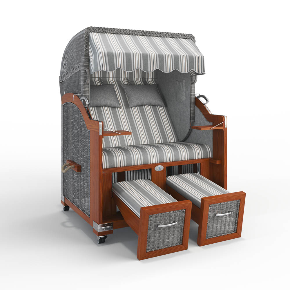 einhängbare Fußstützen: Bei den einhängbaren Fußstützen ist der Bezug  abnehmbar und daher leicht zu reinigen. Zusätzlich verfügen diese Strandkorbmodelle über praktischen Stauraum unter der Sitzbank, in dem die Fußstützen oder die Abdeckhaube verstaut werden können. Auch der Bezug der Sitzbank lässt sich bequem abnehmen.