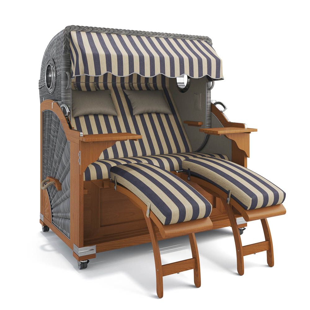 ausziehbare Fußablagen: Die ausziehbaren Fußablagen vom Landhaus Sylt sind besonders praktisch, da sie ohne Montage schnell einsatzbereit sind. Ihr klassisches Design fügt sich harmonisch in die Optik des Strandkorbs ein und erinnert an traditionelle Strandkorbmodelle.